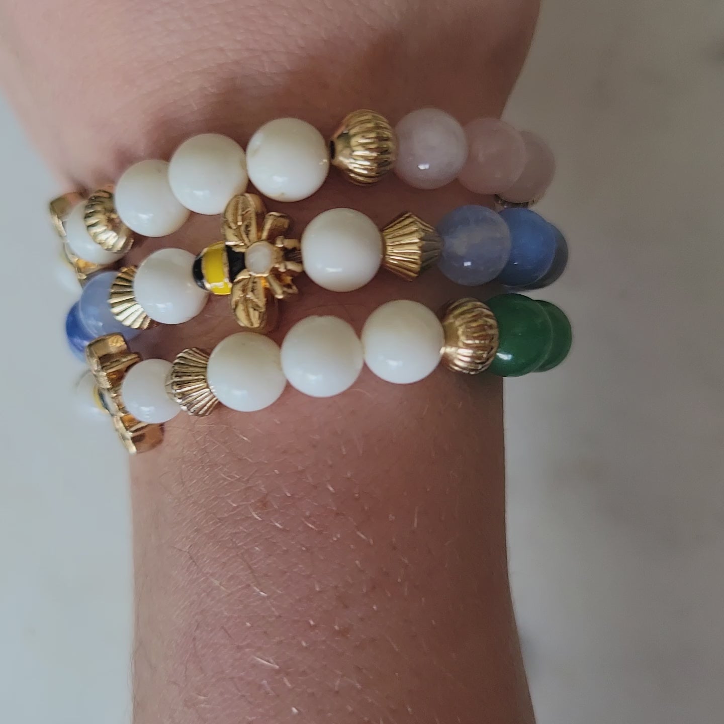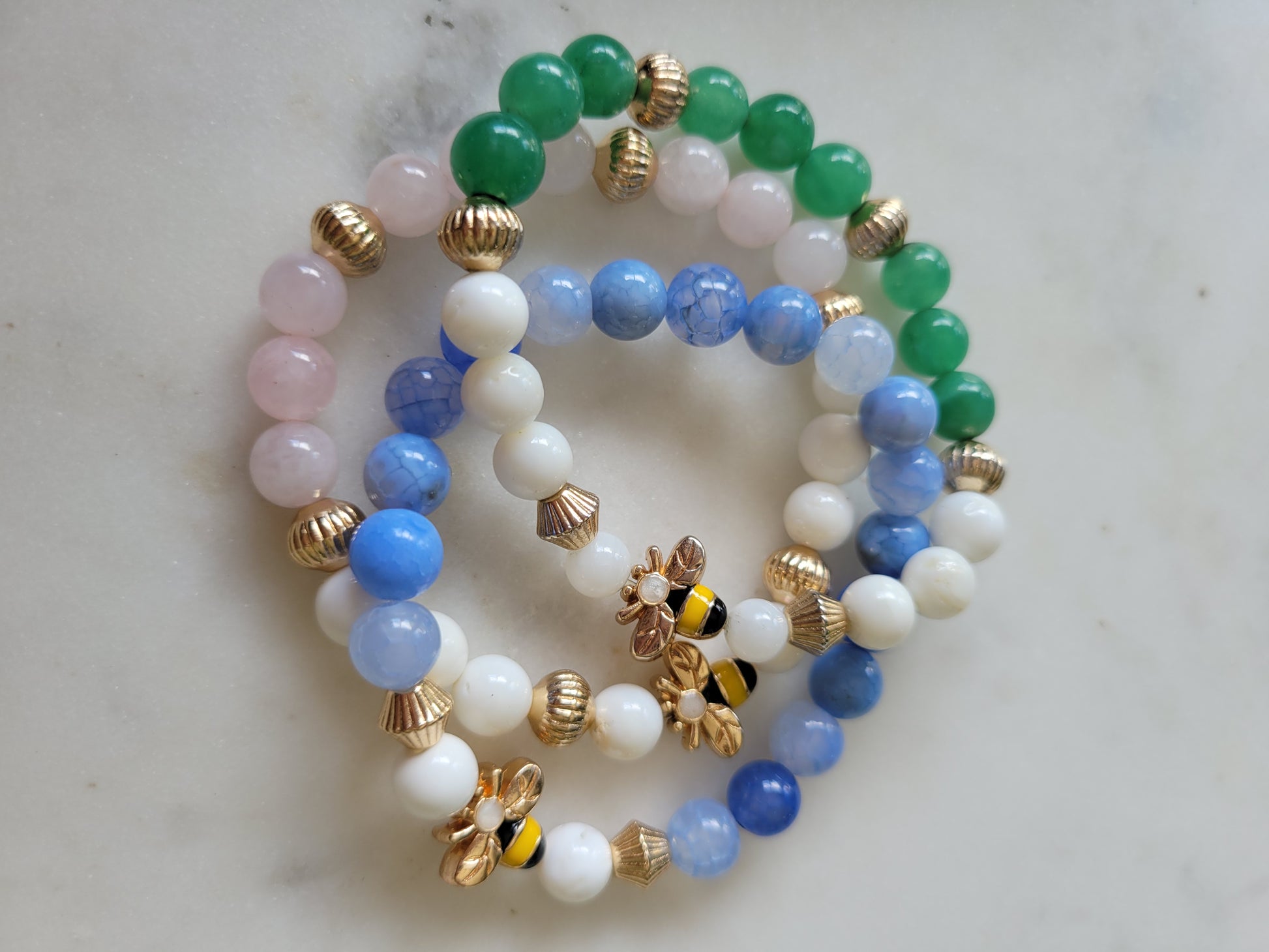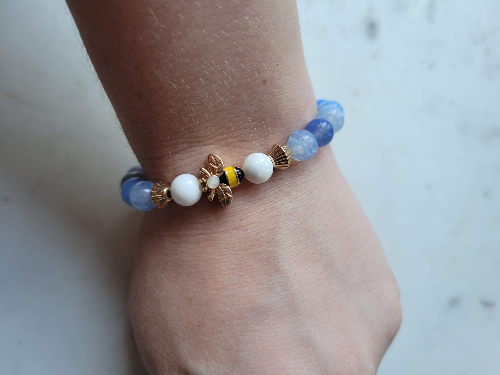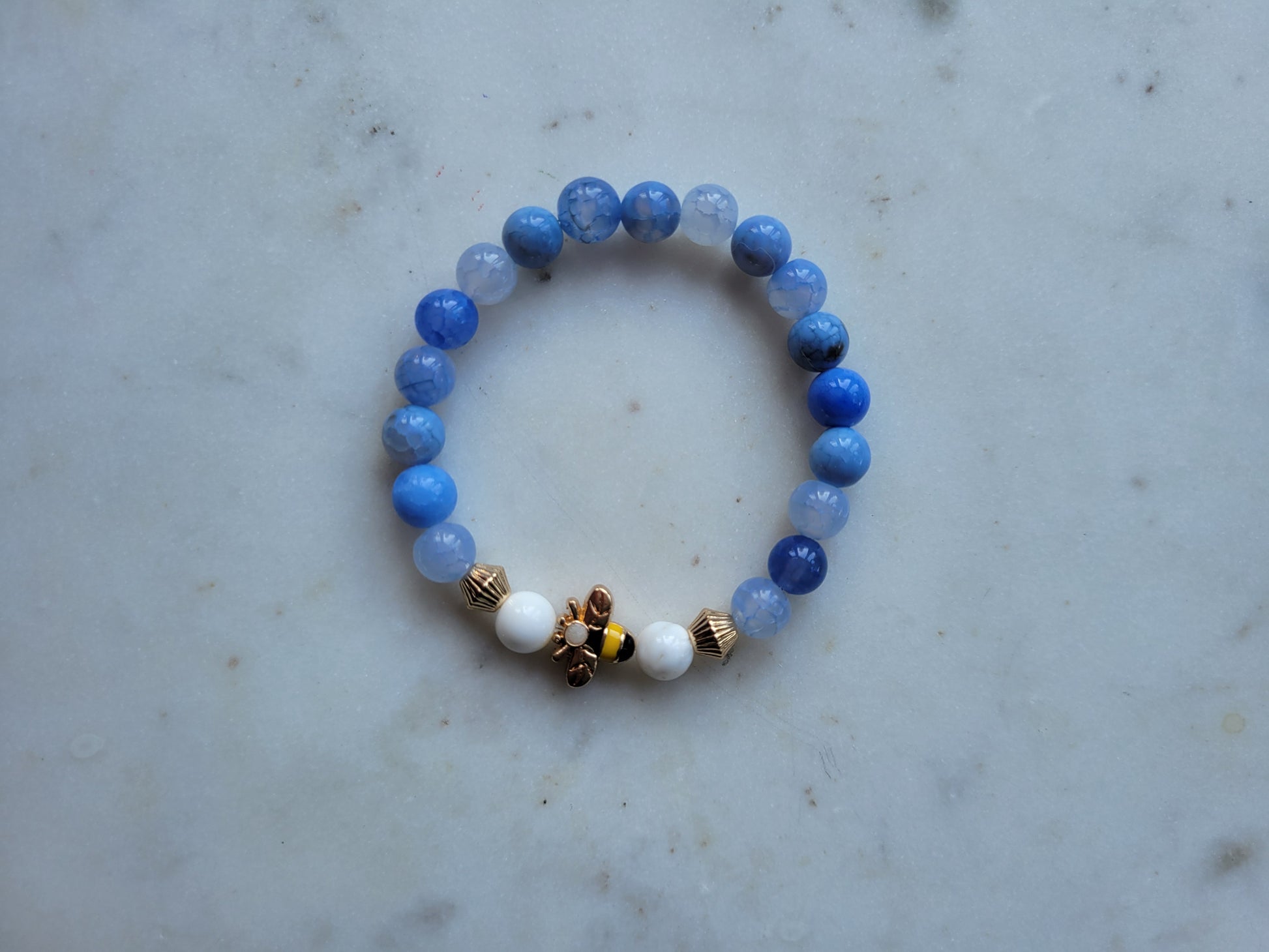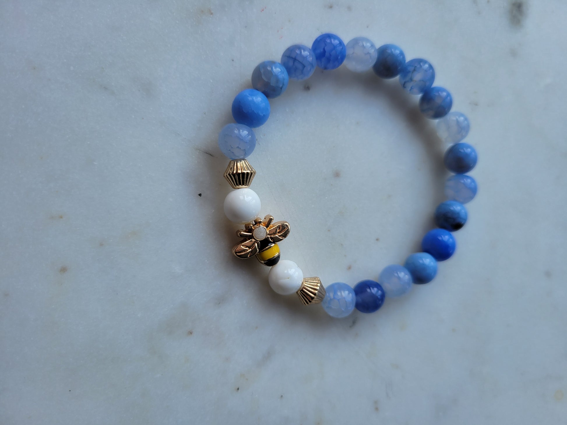 This blue fire agate bracelet features a busy little enamel bee as the focal point. It's accented by metal beads and is made to wear alone or in a stack. This beautiful piece is pictured above with the coordinating Bee Stack Bracelets.
