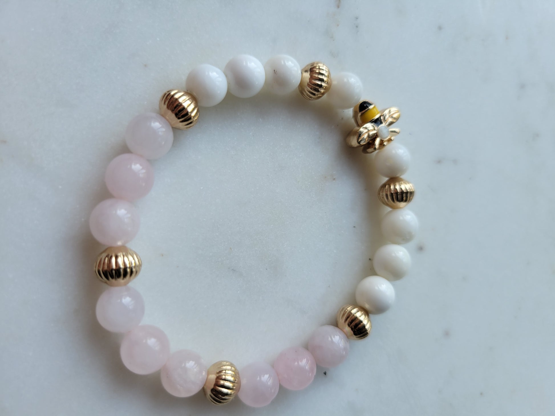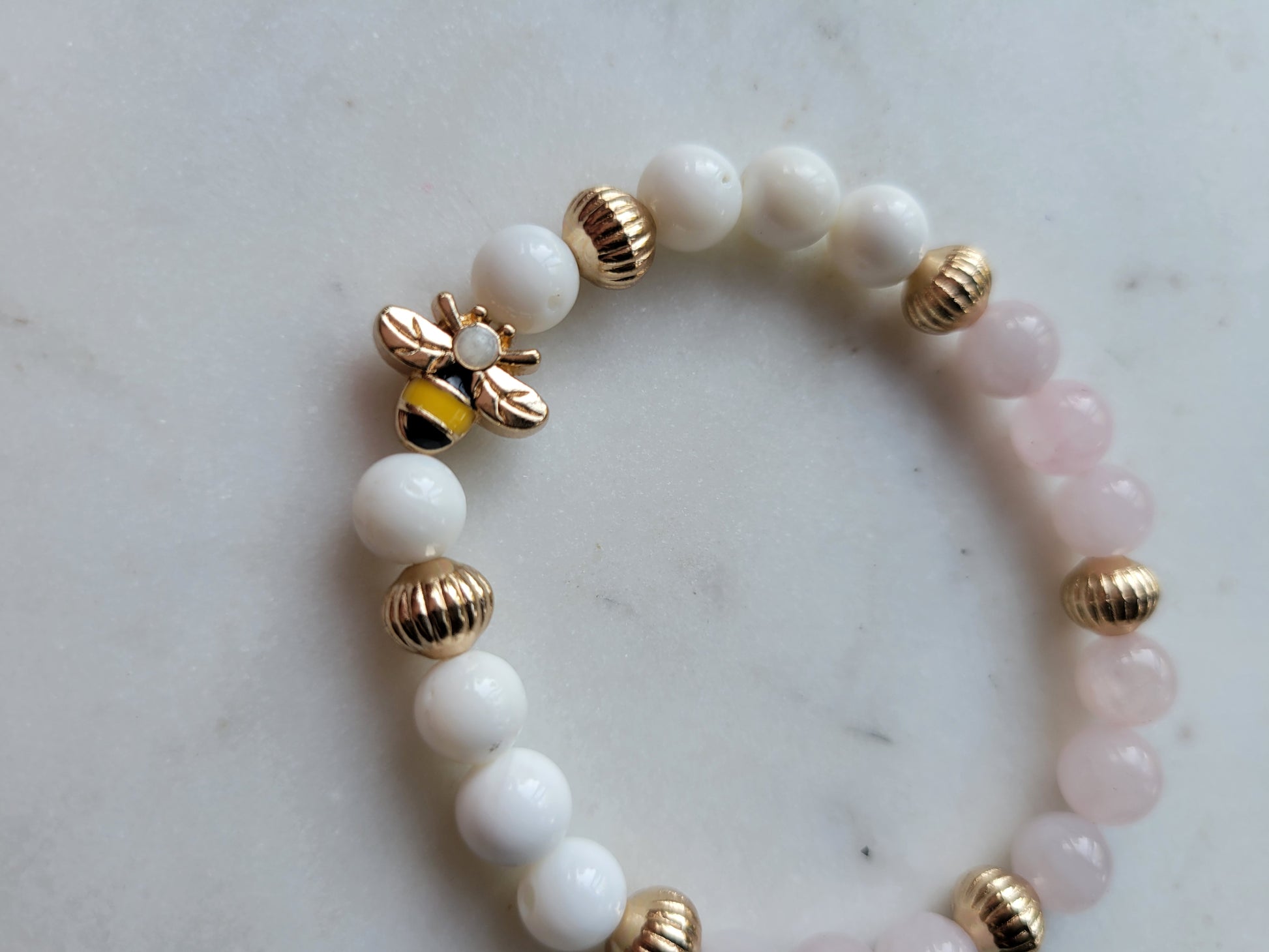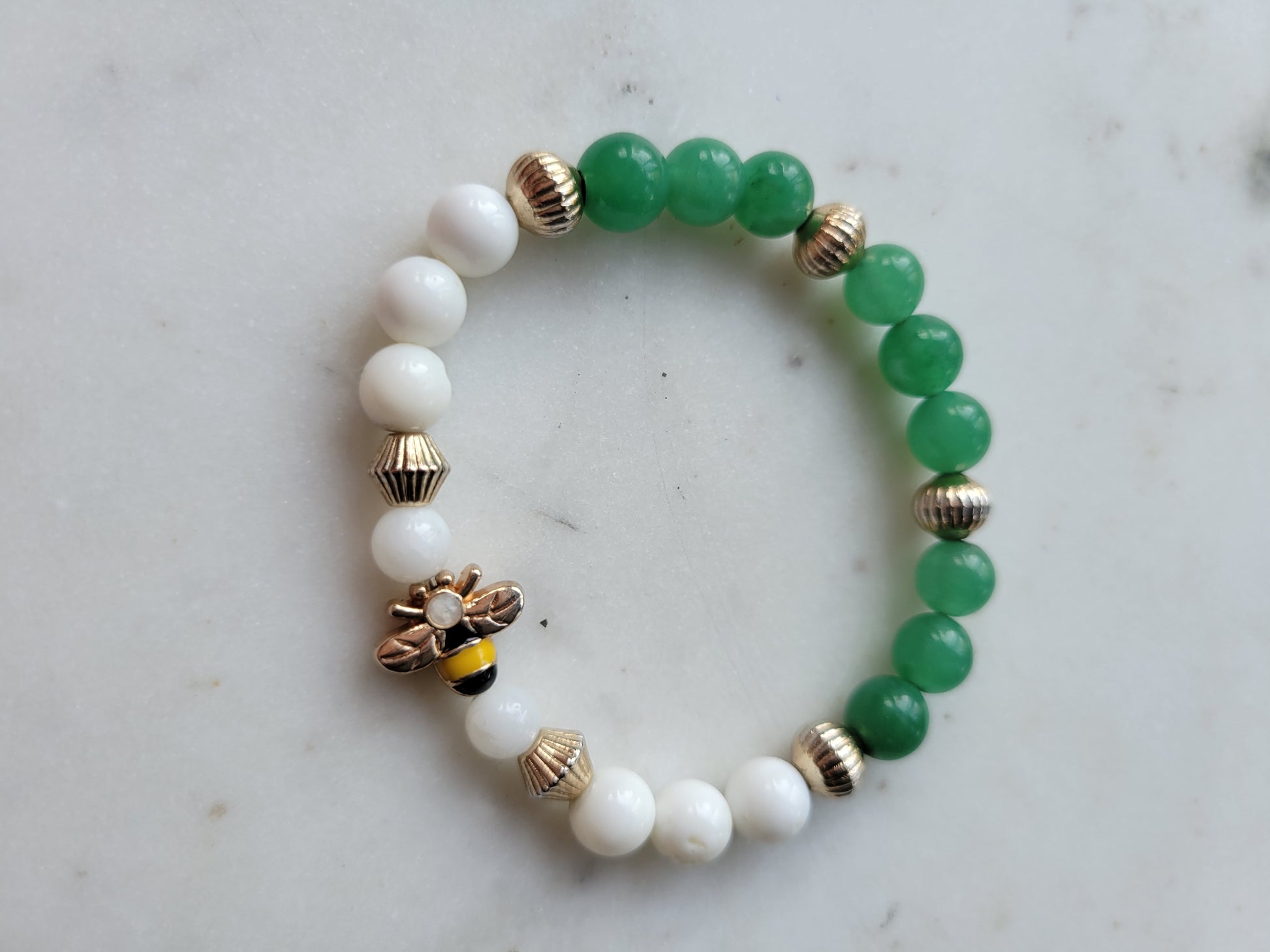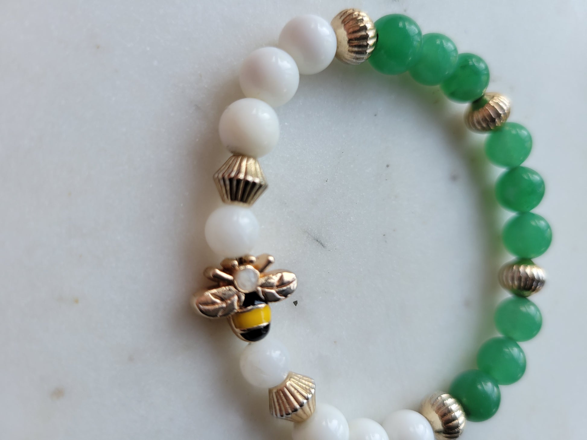 This colorful bracelet stack is a coordinating set of two, both featuring a busy little enamel bee as the focal point. One bracelet is rose quartz and shell beads, it's sister is green adventurine and shell beads. Both are accented by metal beads and are made to wear alone or in a stack. This beautiful piece is pictured above with the blue fire agate bee bracelet (sold separately).