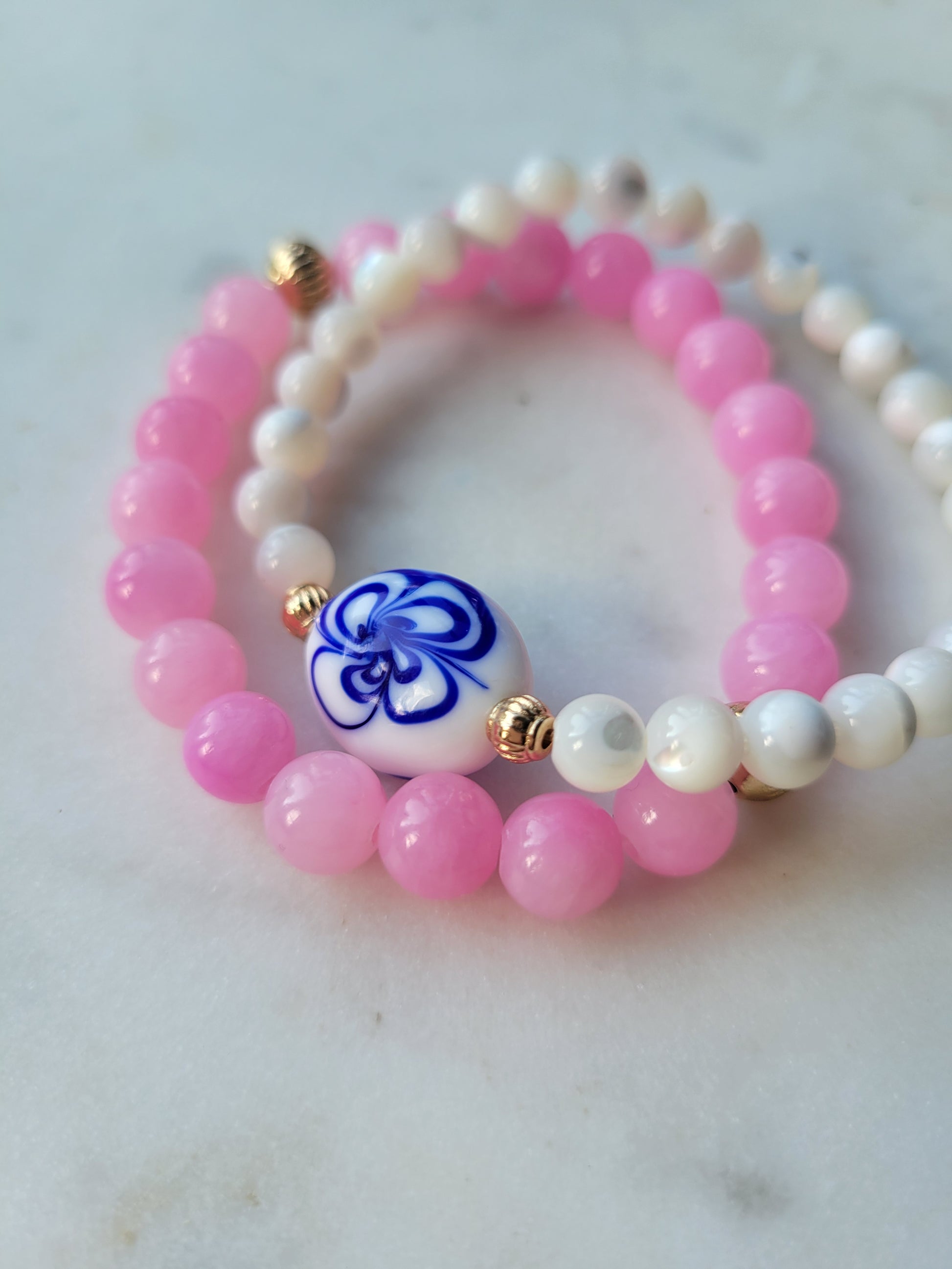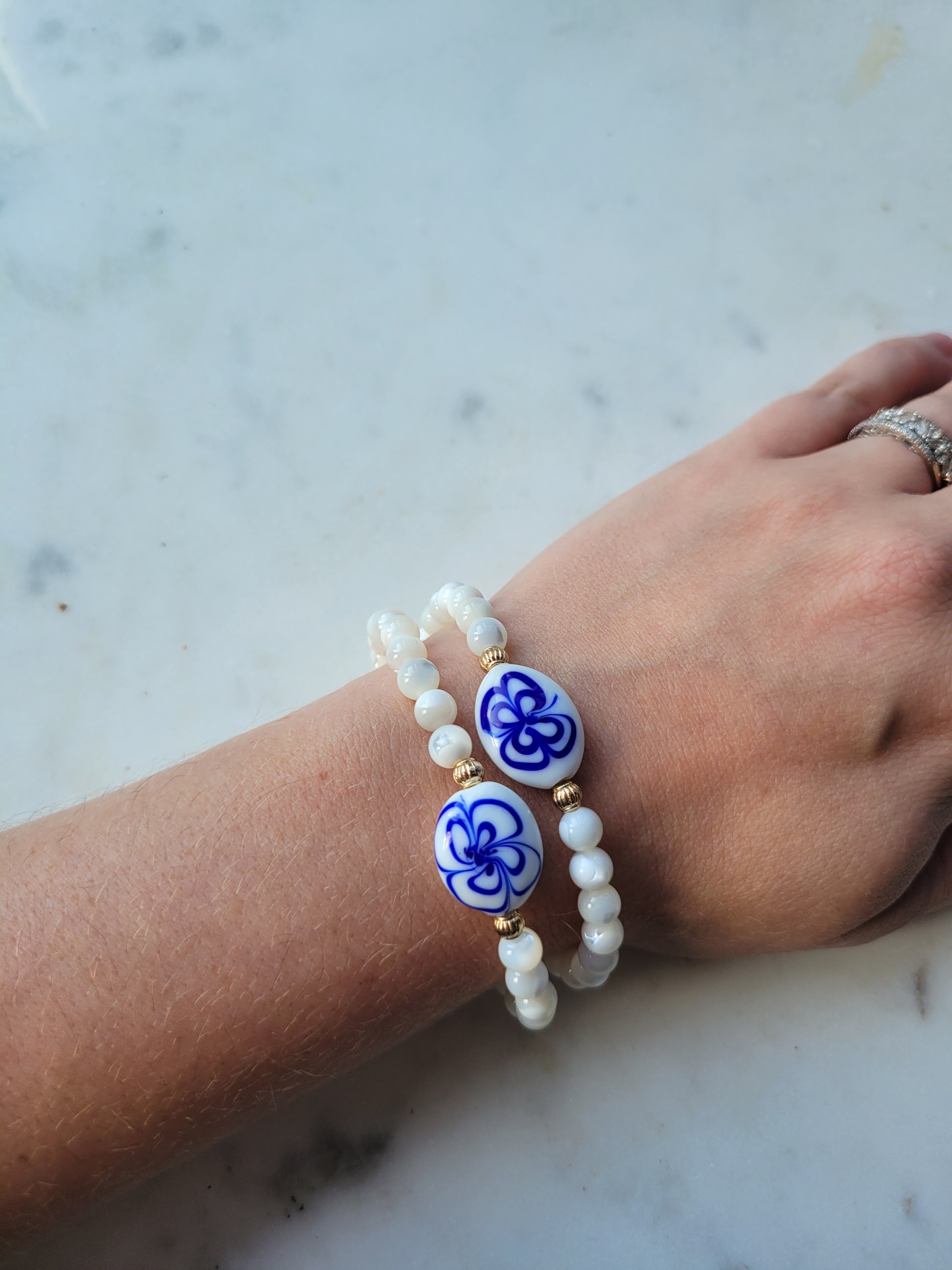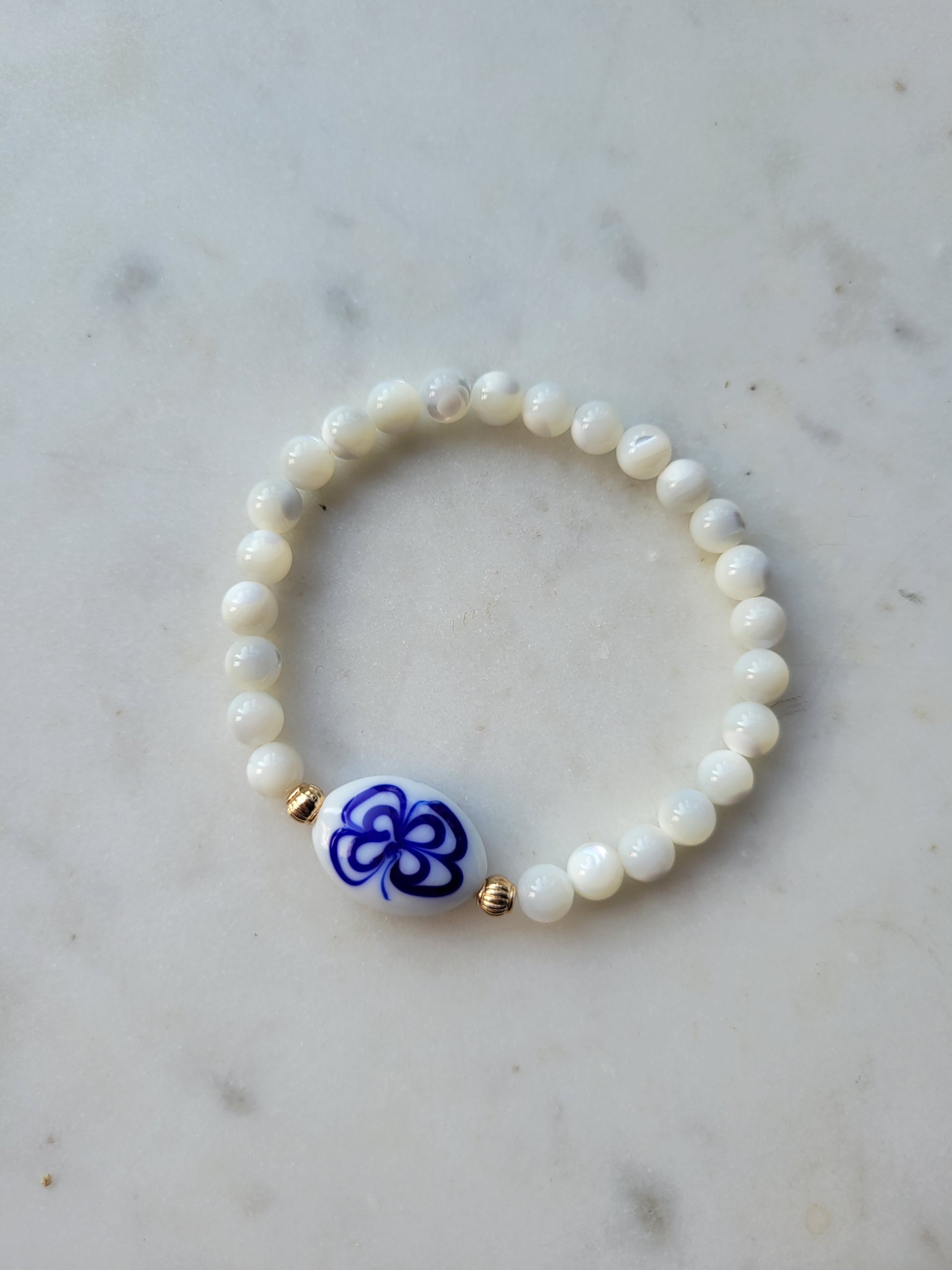 Mother of Pearl beads with a ceramic blue and white focal bead- gold metal beads for accent.