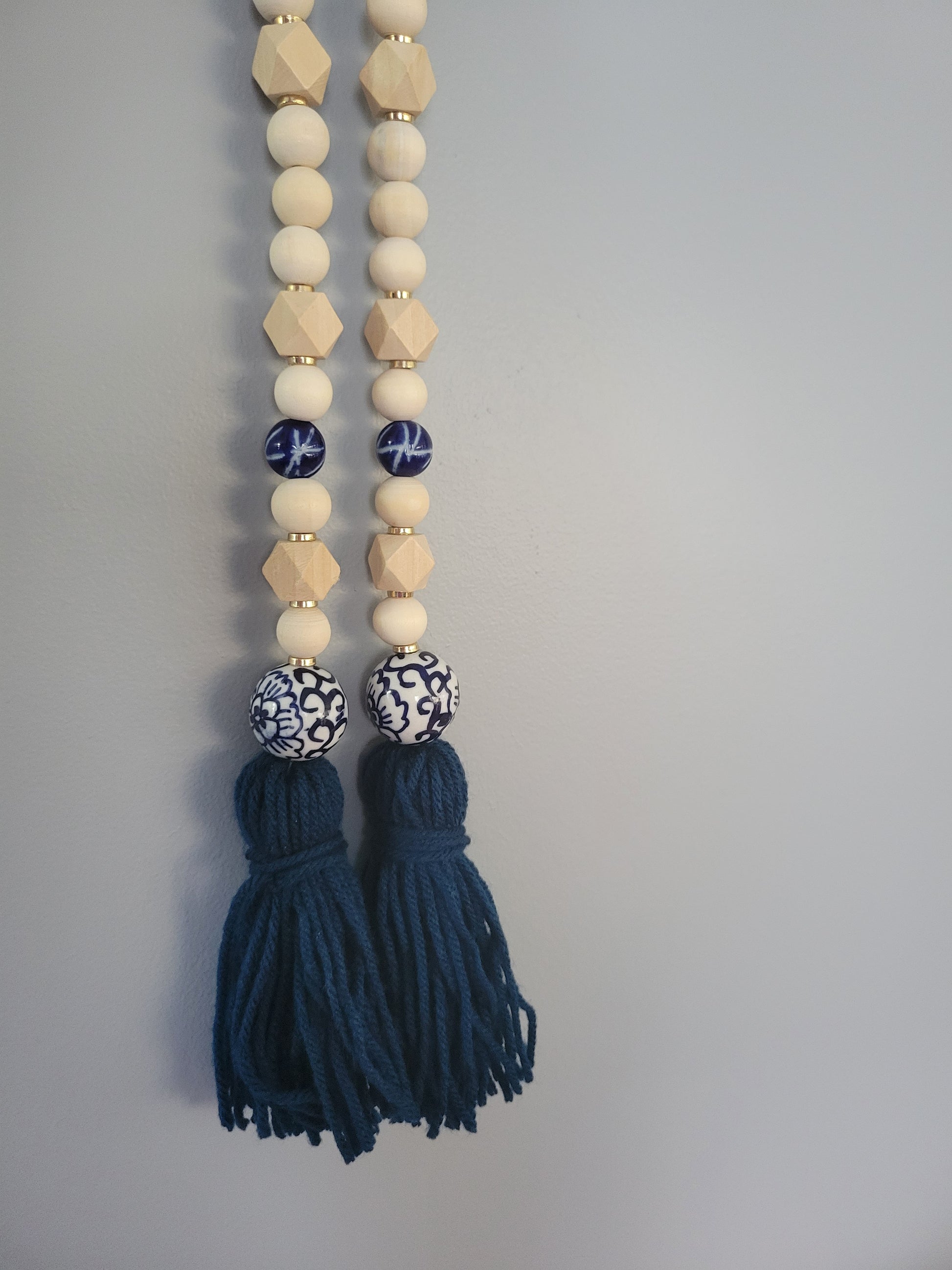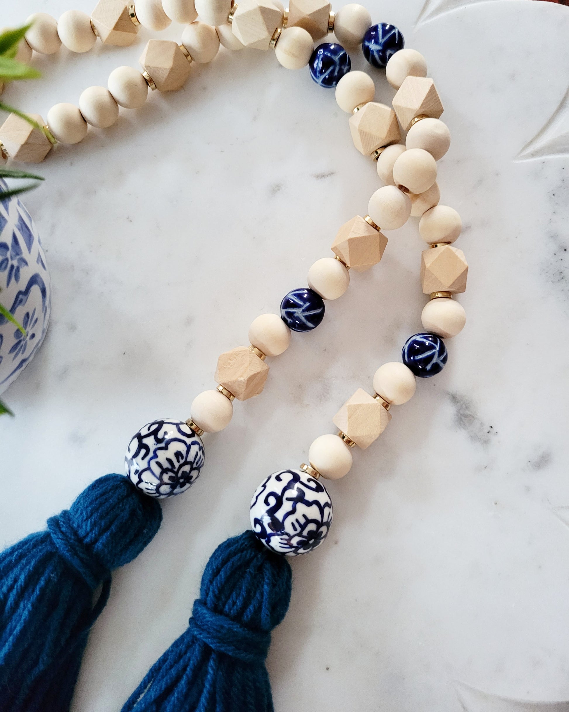This beautiful piece is made with blue and white porcelain beads and is accented with dainty bits of gold throughout. It's an updated twist on a vintage look and would look great on a coffee table, draped around a vase or plant, or as part of a centerpiece.