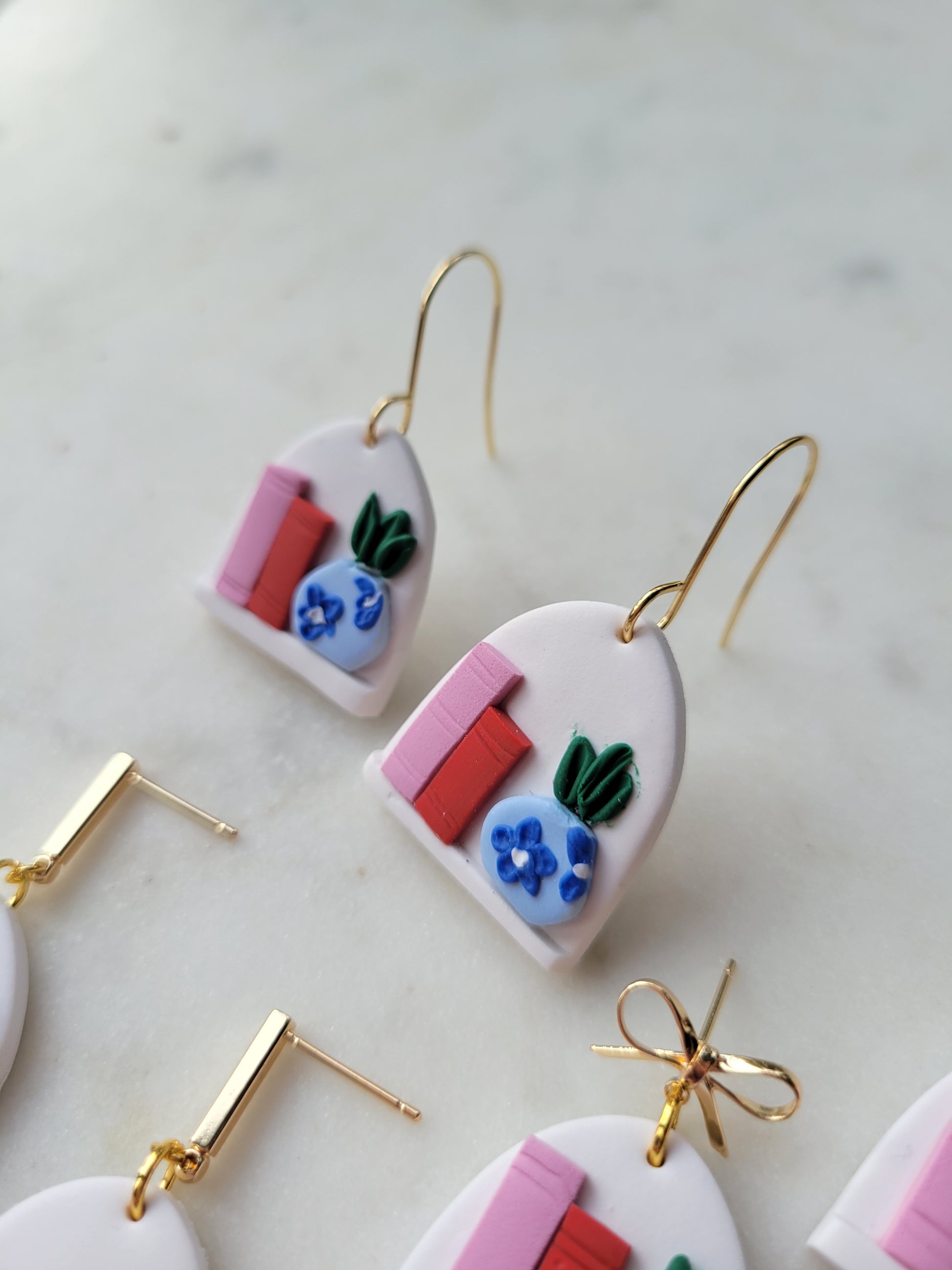 ✨ Handmade Polymer Clay Earrings – Colorful Book Lover Shelf with Snake Plant & Flower Pot | Lightweight | Nickel-Free | Clip-On & Pierced Options ✨