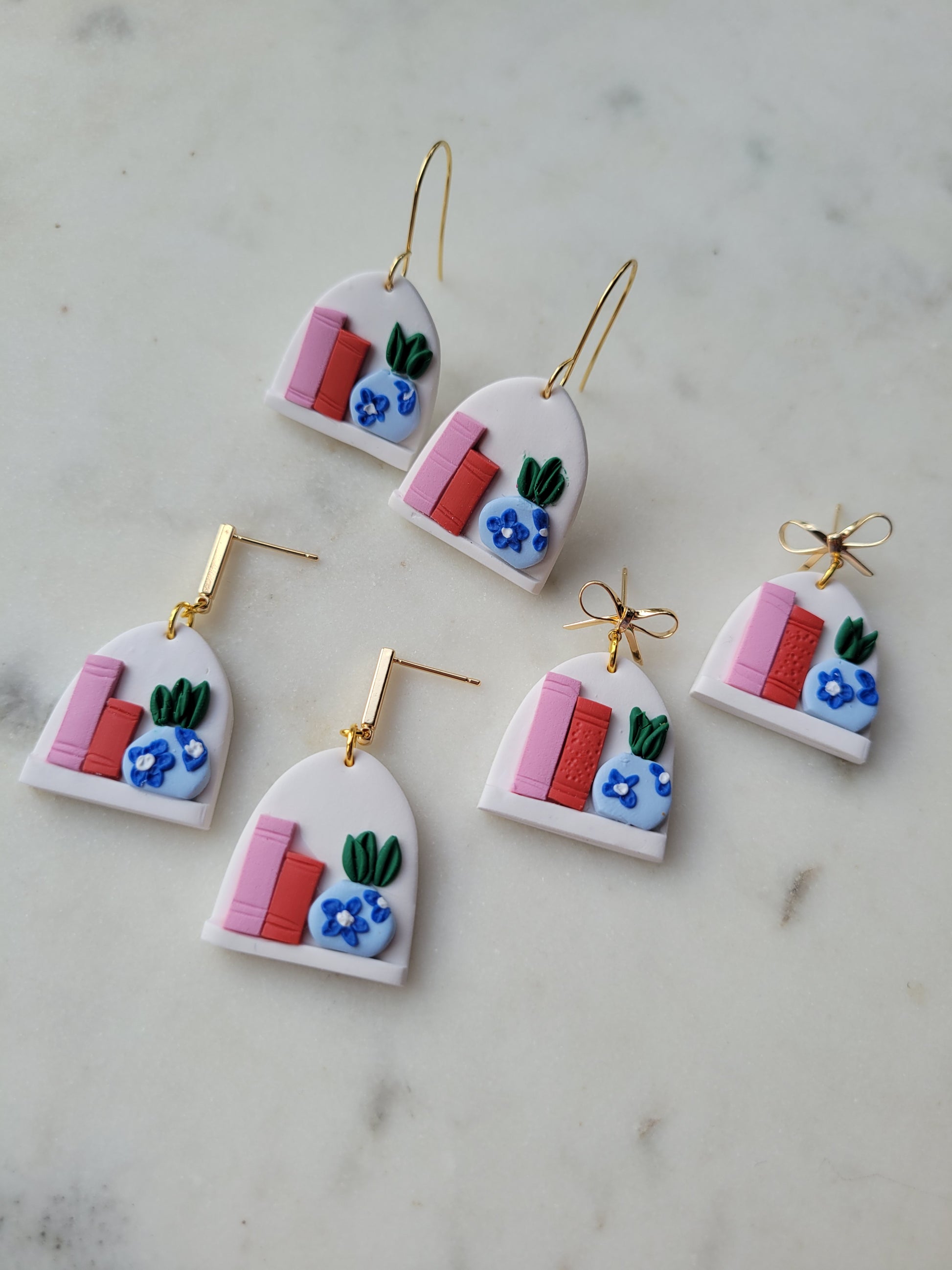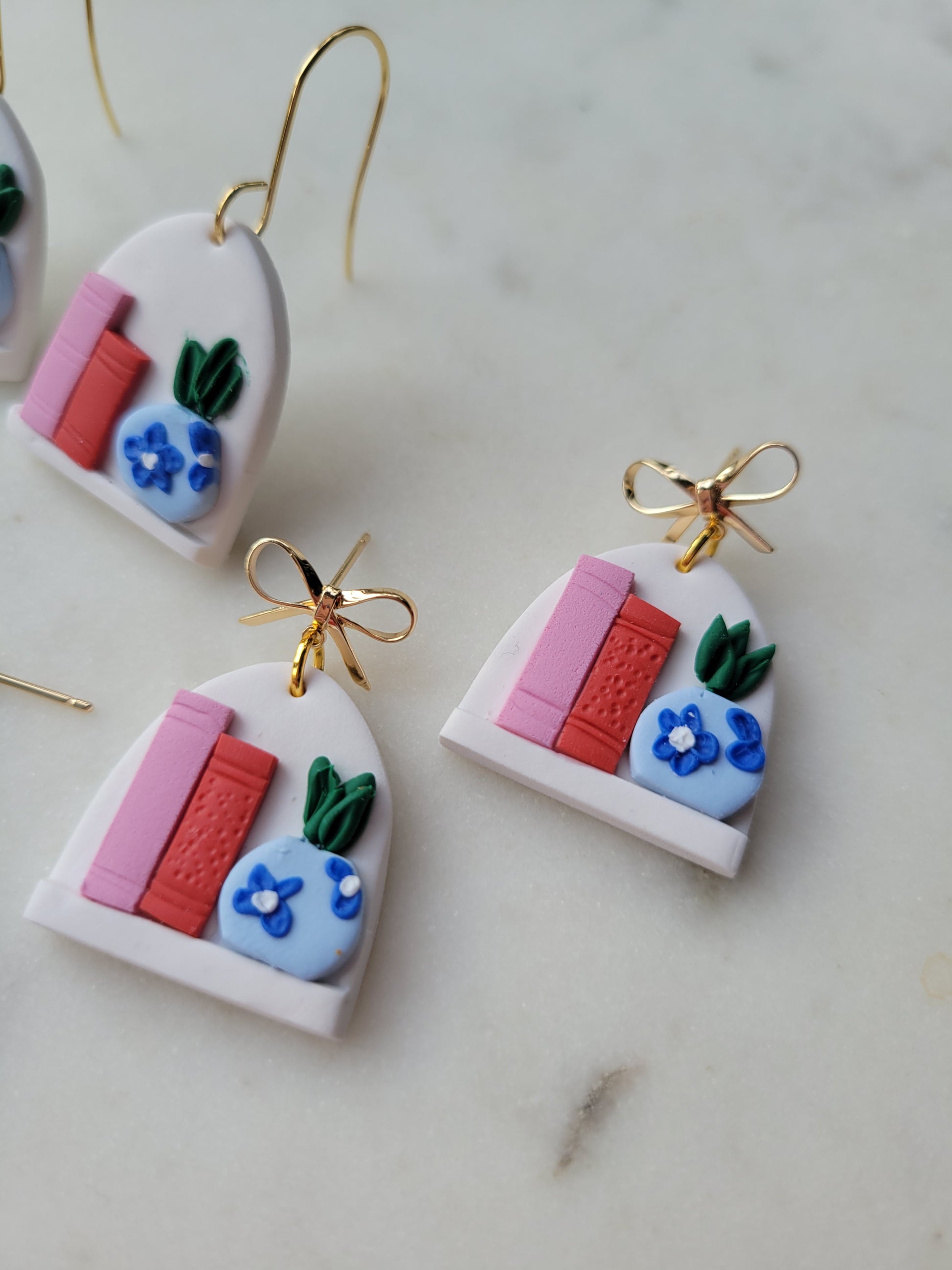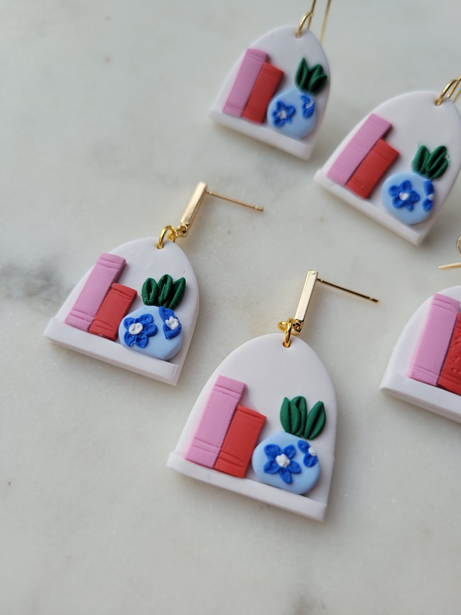 Calling all bookworms, plant lovers, and earring addicts – your new favorite statement piece is here! These vibrant, handmade polymer clay earrings feature a whimsical miniature bookshelf scene with bright, colorful books, a charming hand-sculpted flower pot, and a leafy green snake plant – all crafted entirely from clay! 🌿📚