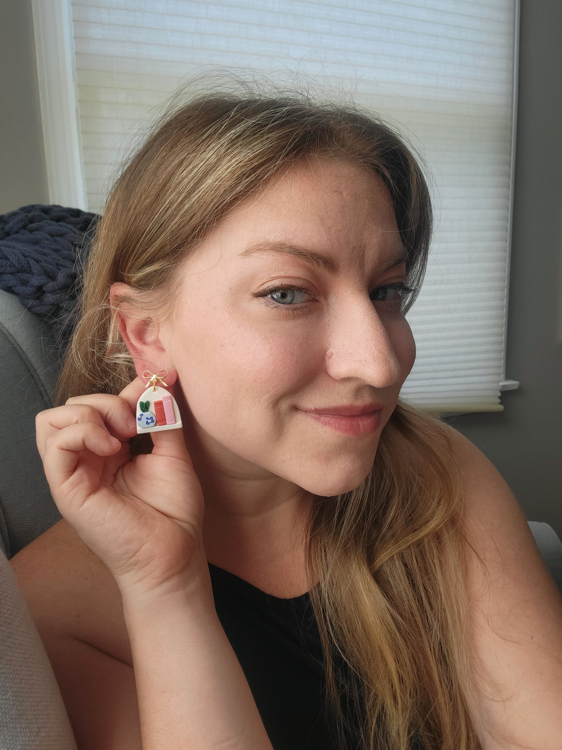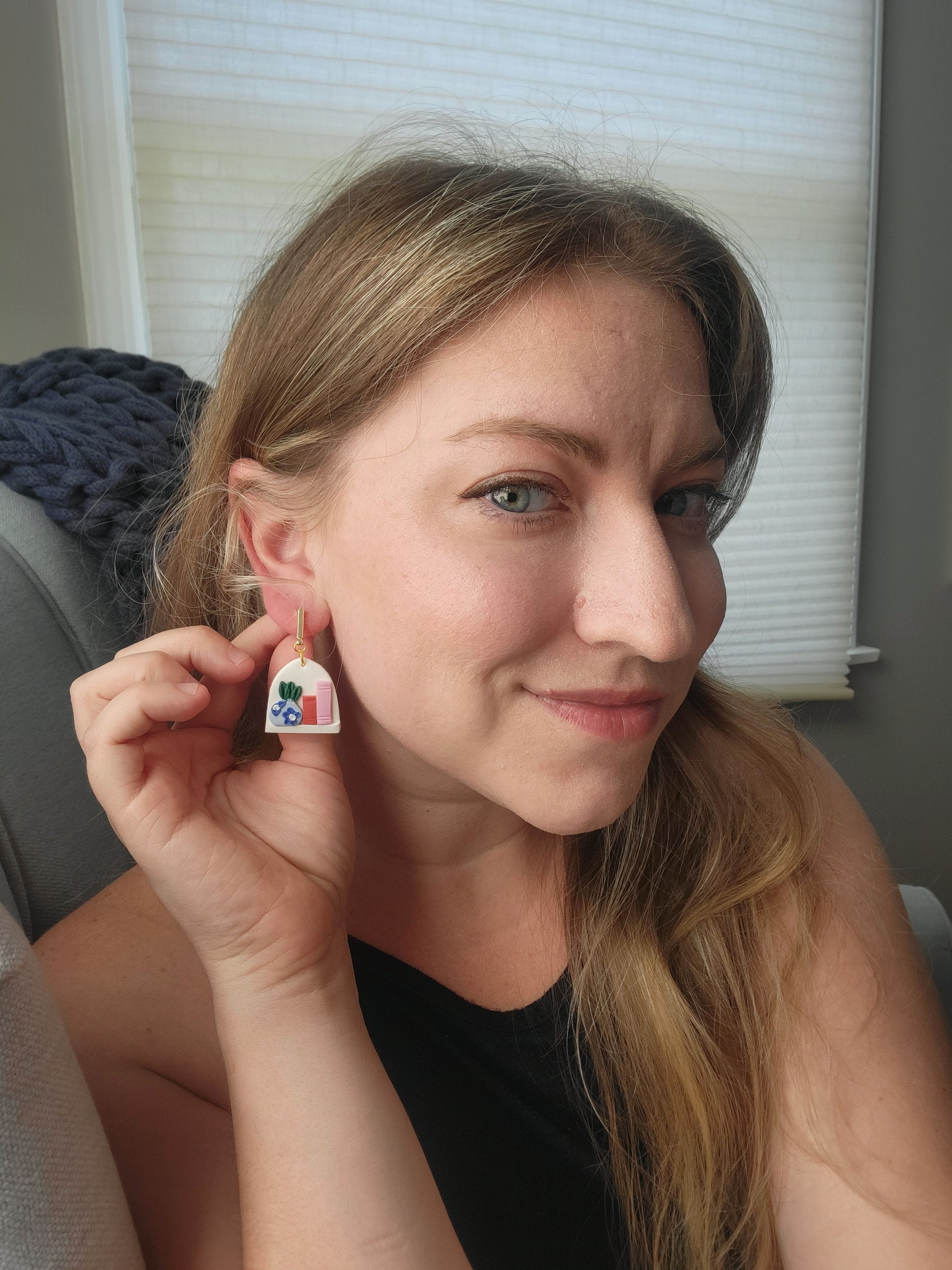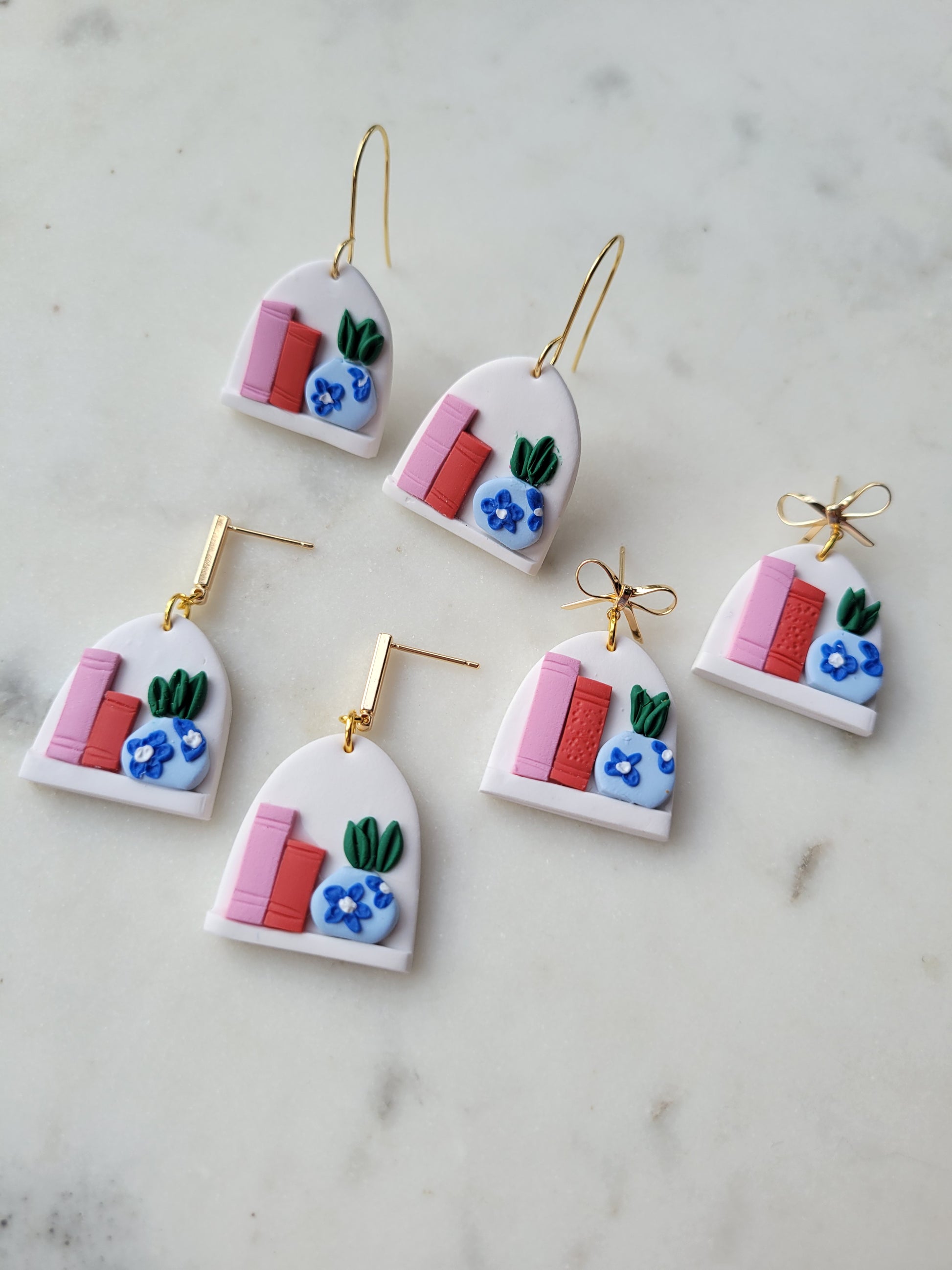 Calling all bookworms, plant lovers, and earring addicts – your new favorite statement piece is here! These vibrant, handmade polymer clay earrings feature a whimsical miniature bookshelf scene with bright, colorful books, a charming hand-sculpted flower pot, and a leafy green snake plant – all crafted entirely from clay! 🌿📚