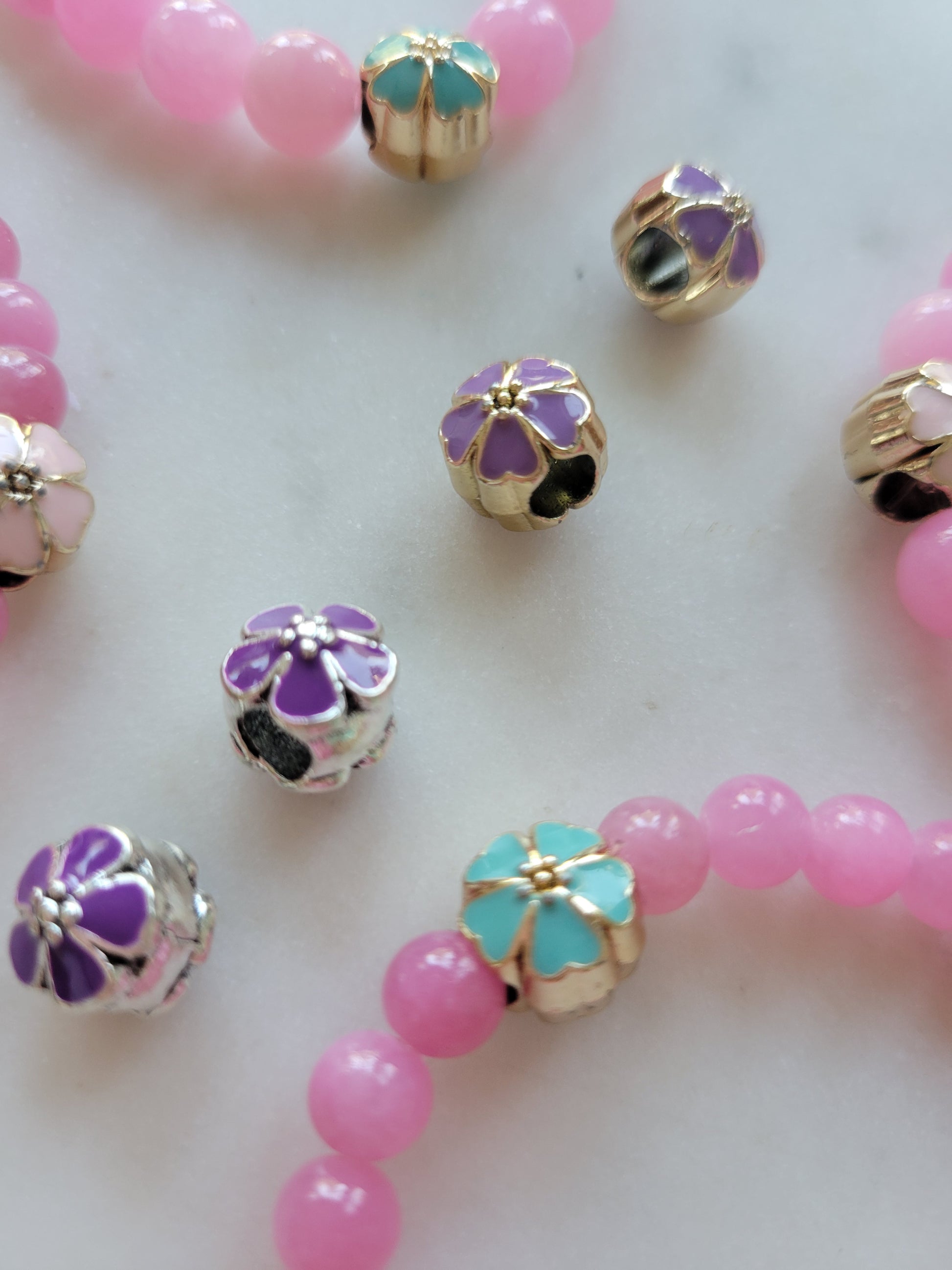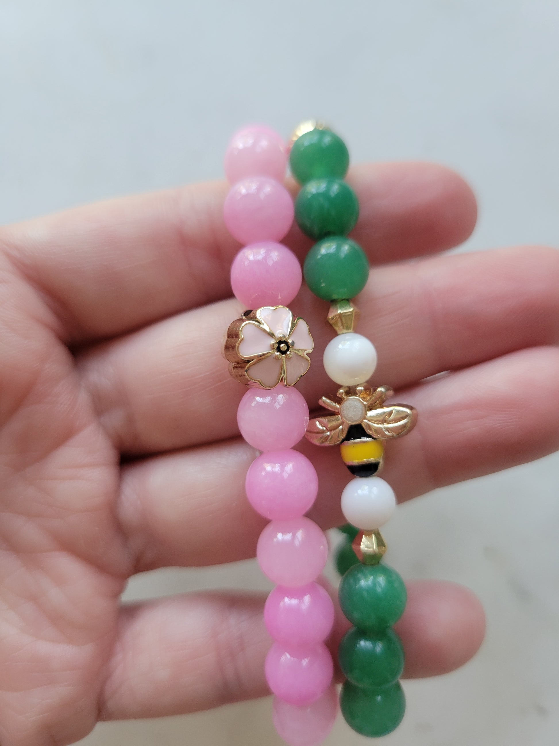 This beautiful pink jade bracelet has a small flower at it's center. Custom color options available!
