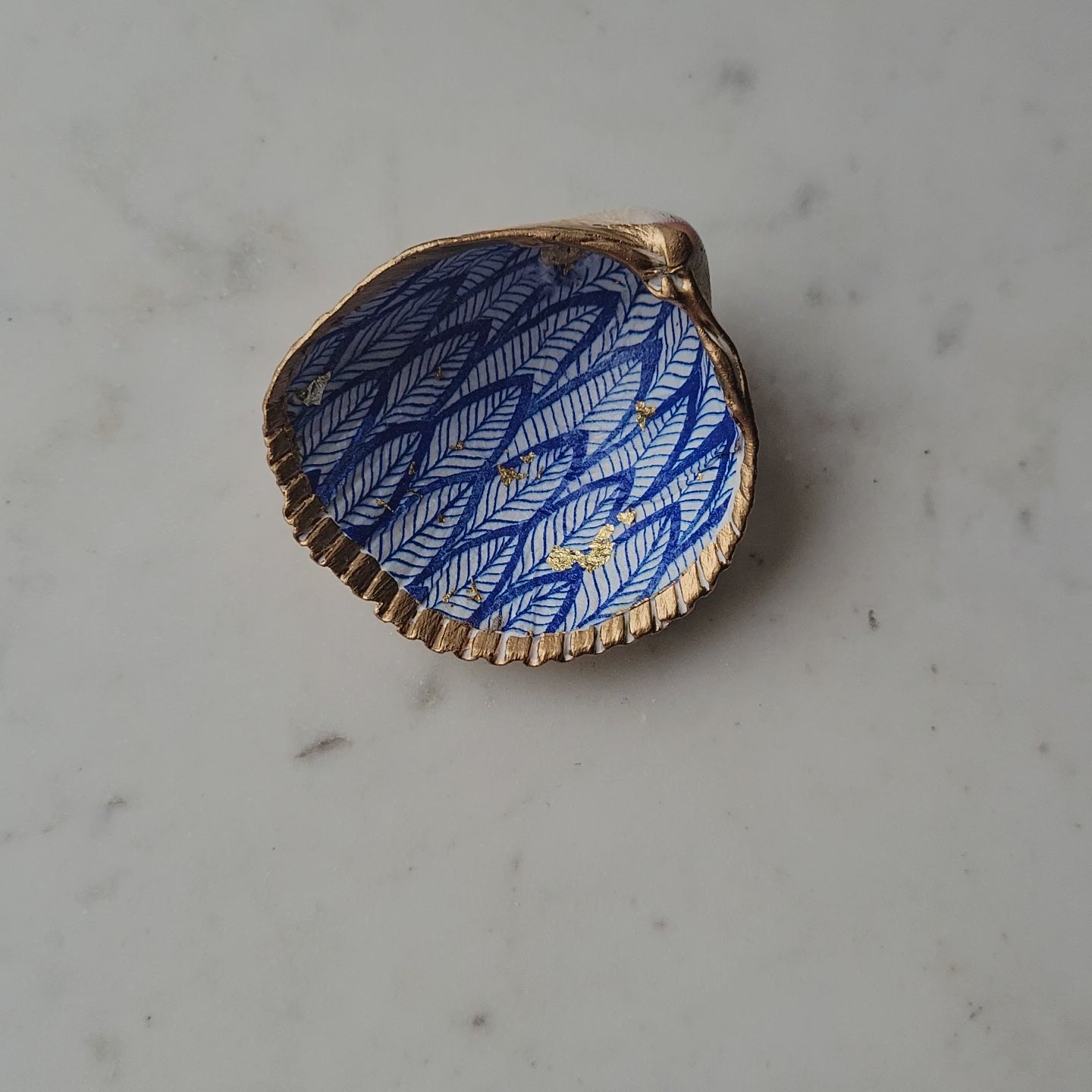 The dish is handmade from a clam shell found on the beach in the Outer Banks, NC. A beautiful blue and white print is featured on this trinket dish, embellished with gold leaf and the edge has a painted gold detail.