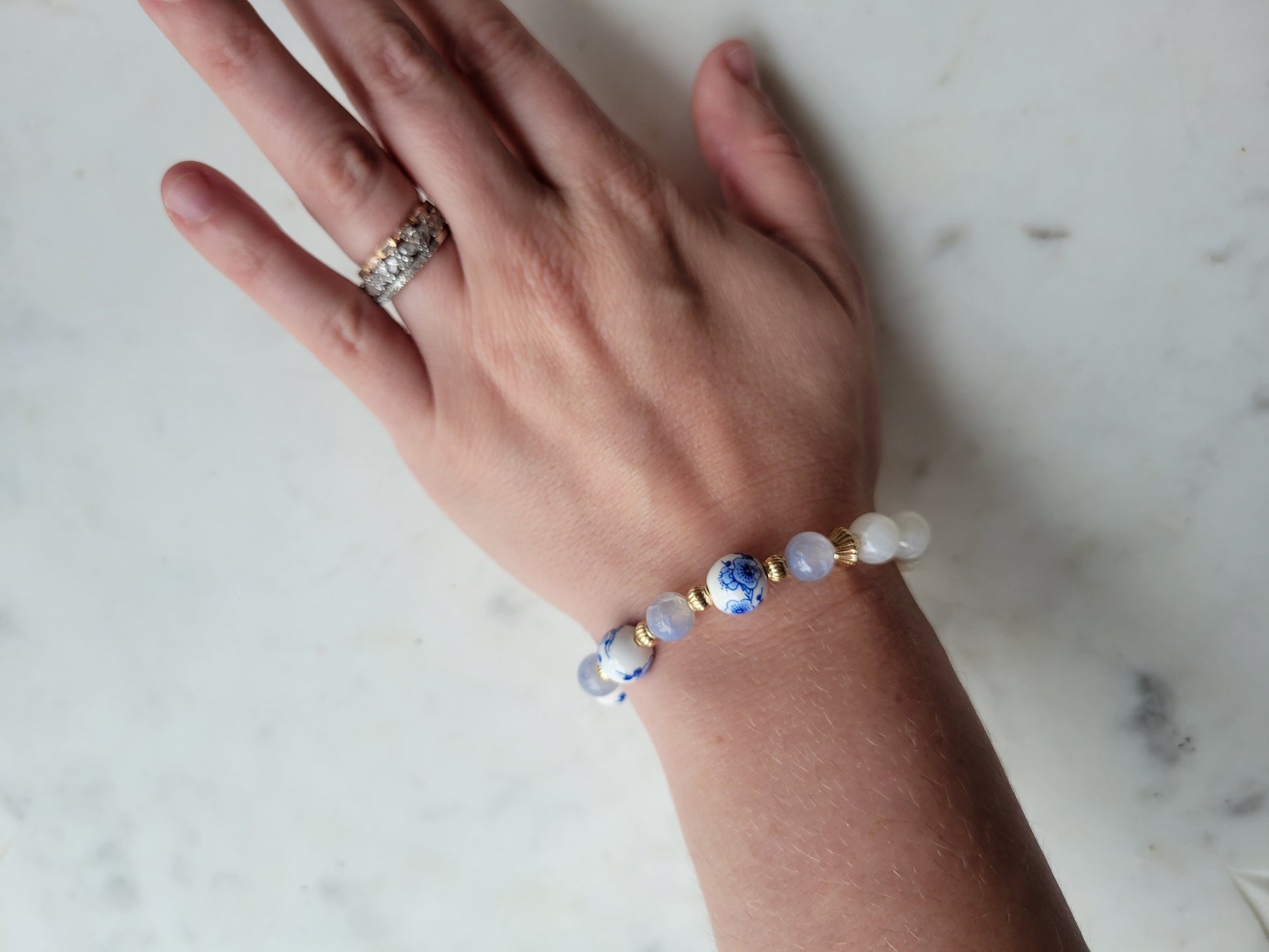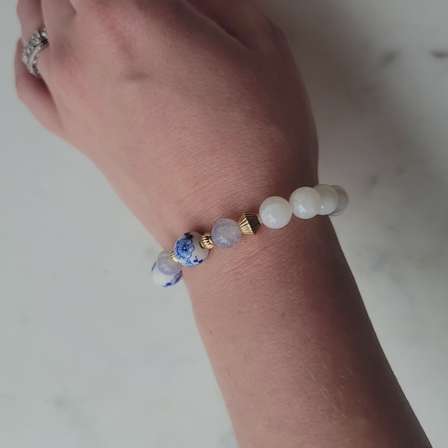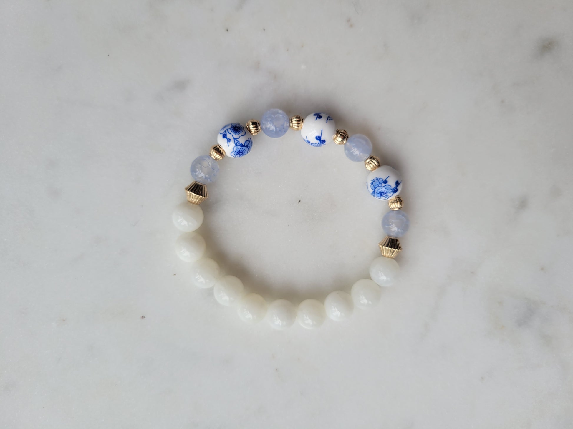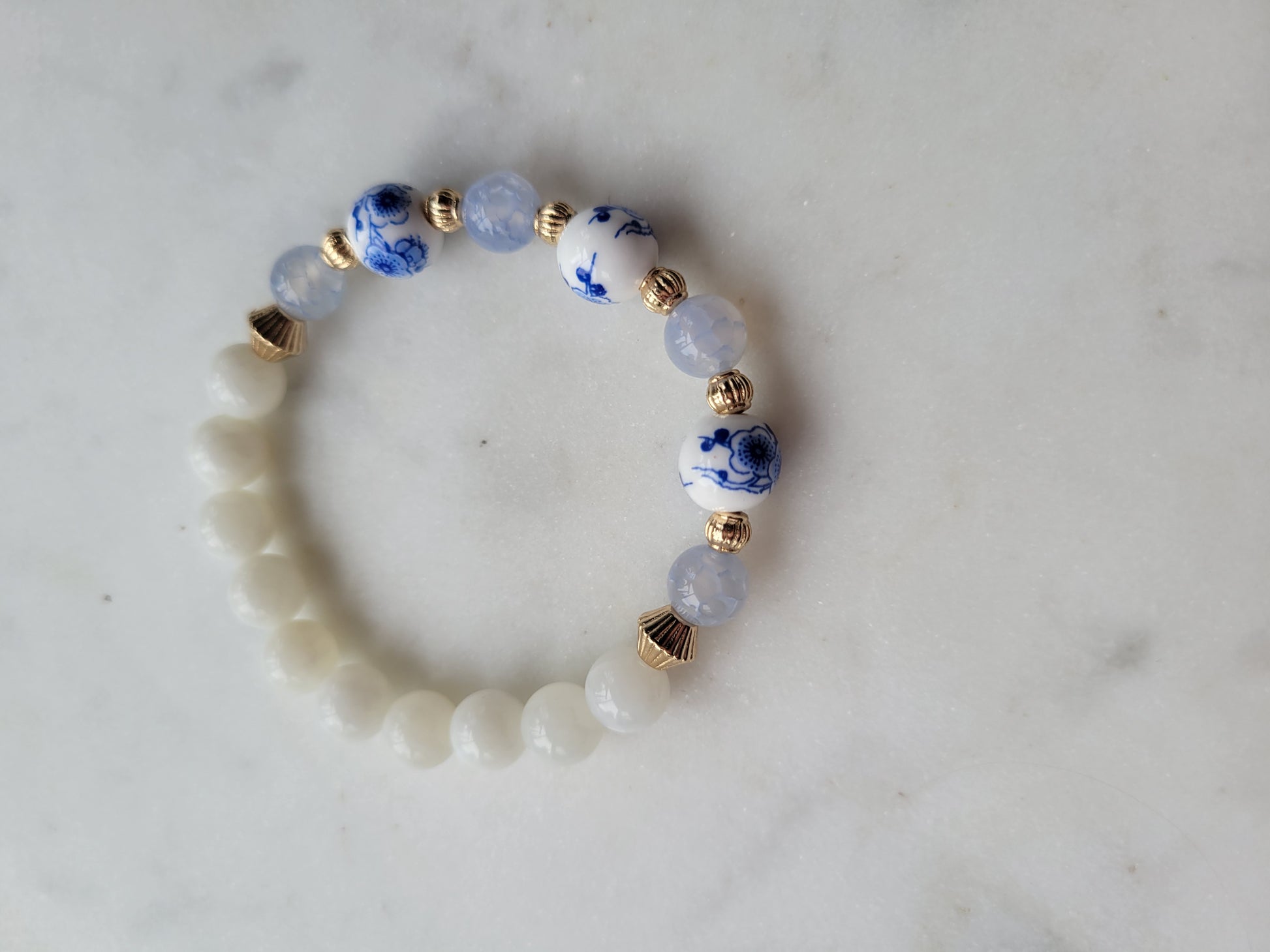 This bracelet combines the elegant classic cloissone beads with blue fire agate, milky white shell, and metal accents beads.