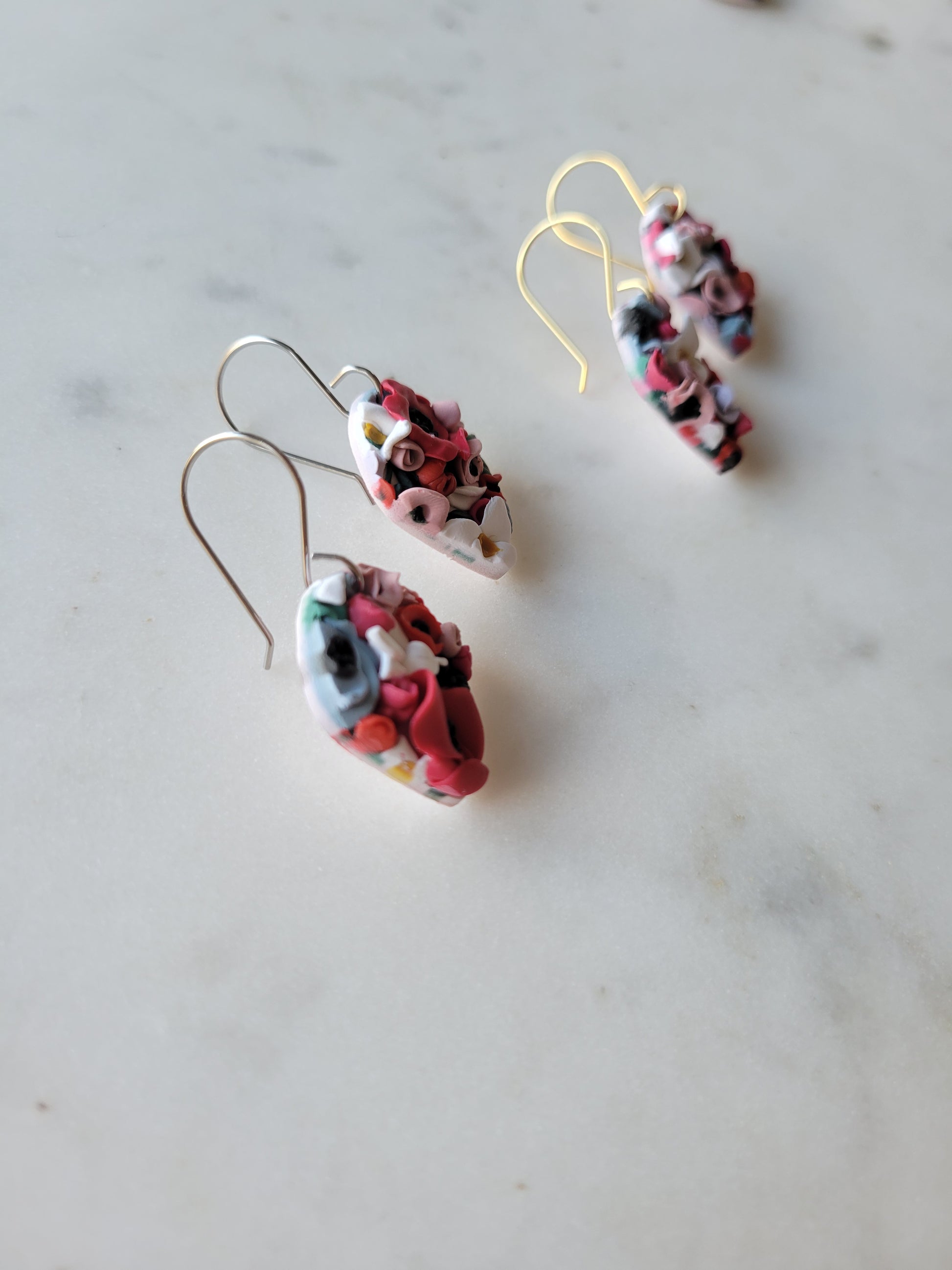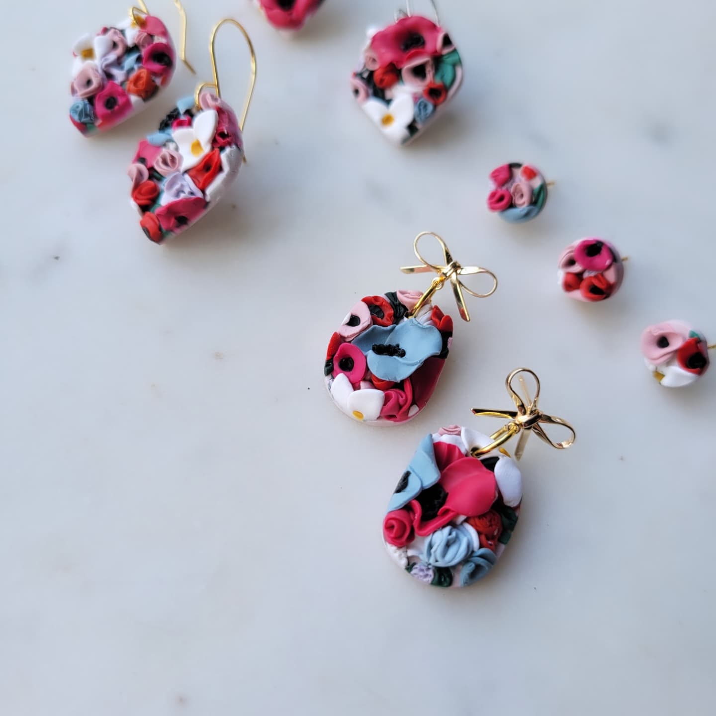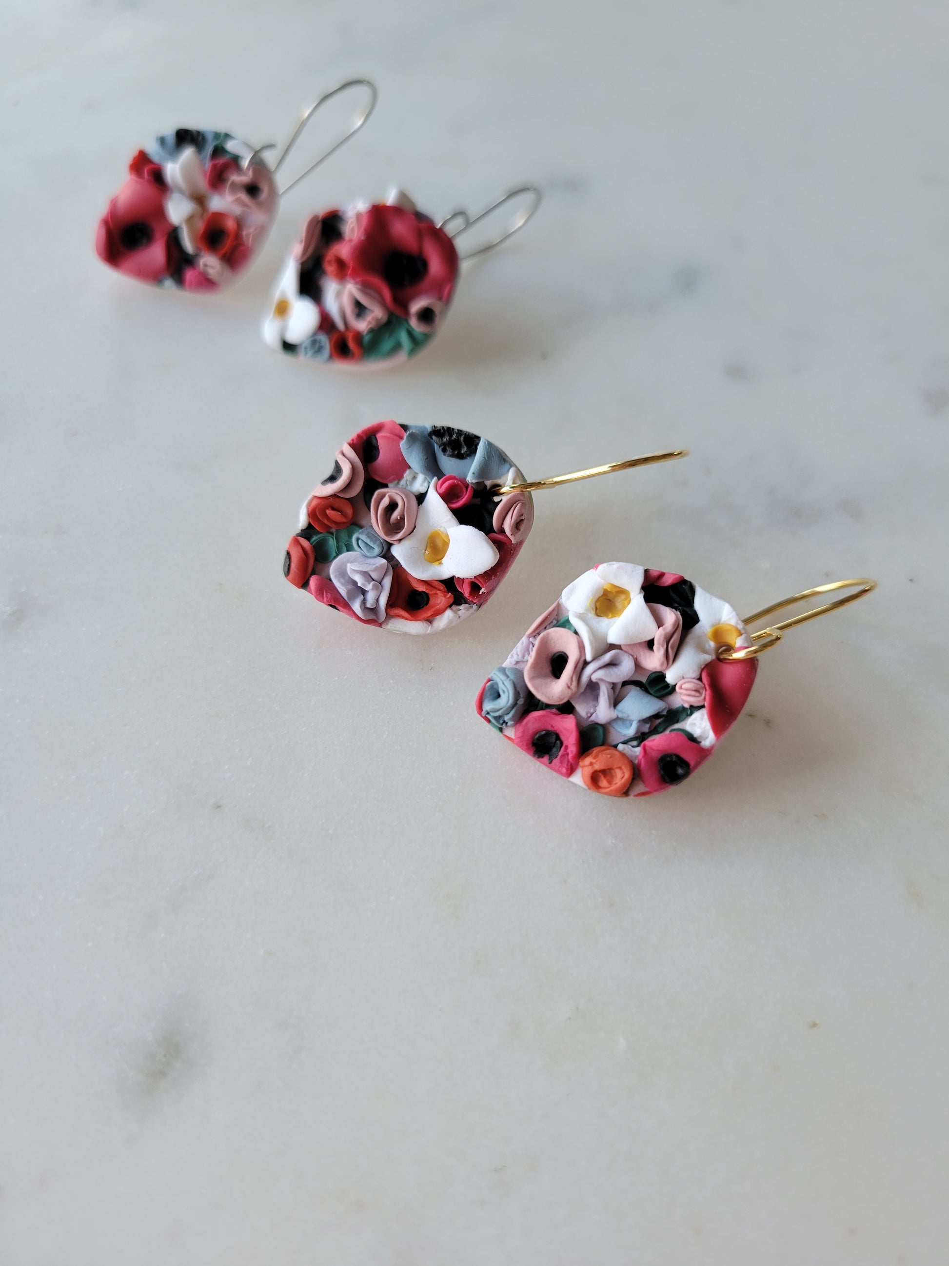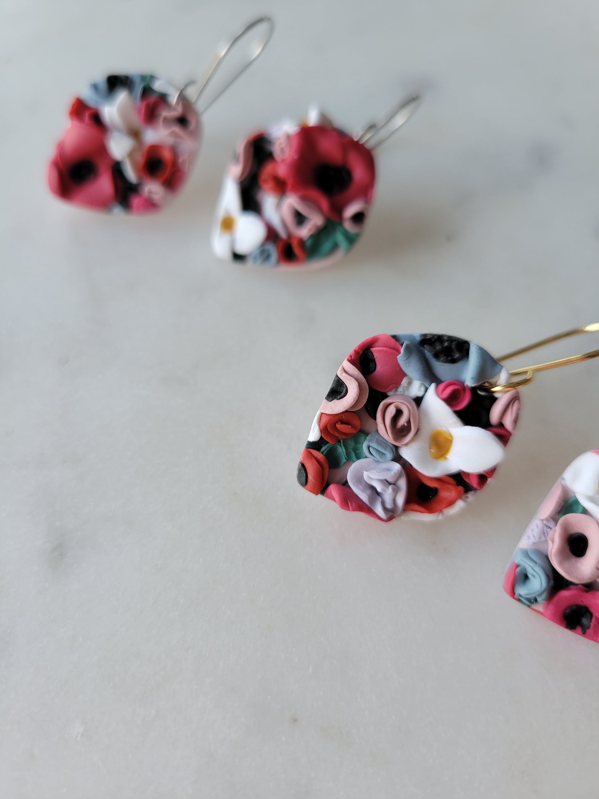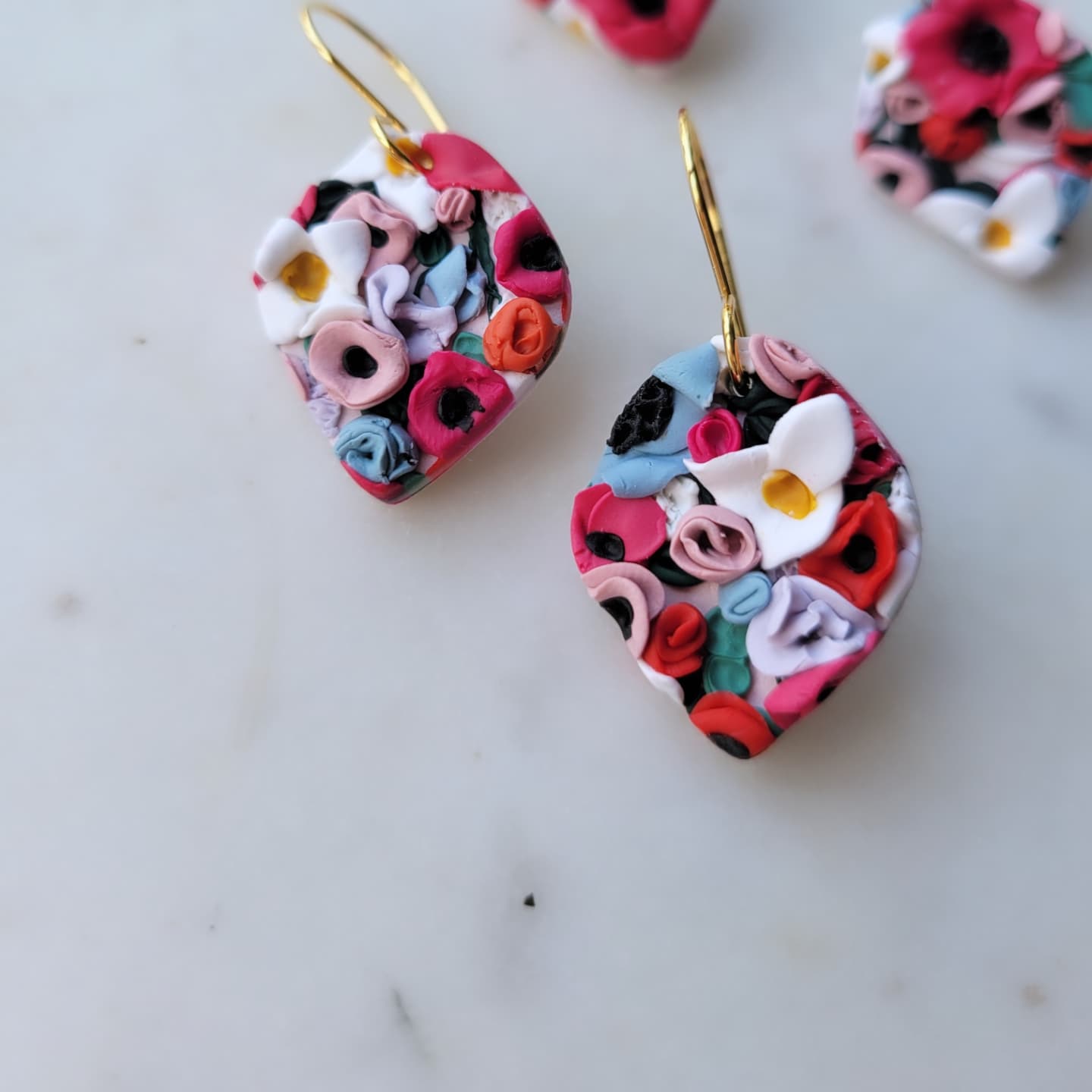 Each flower and leaf is carefully handcrafted on a single clay slab and cut into three different styles of earrings.