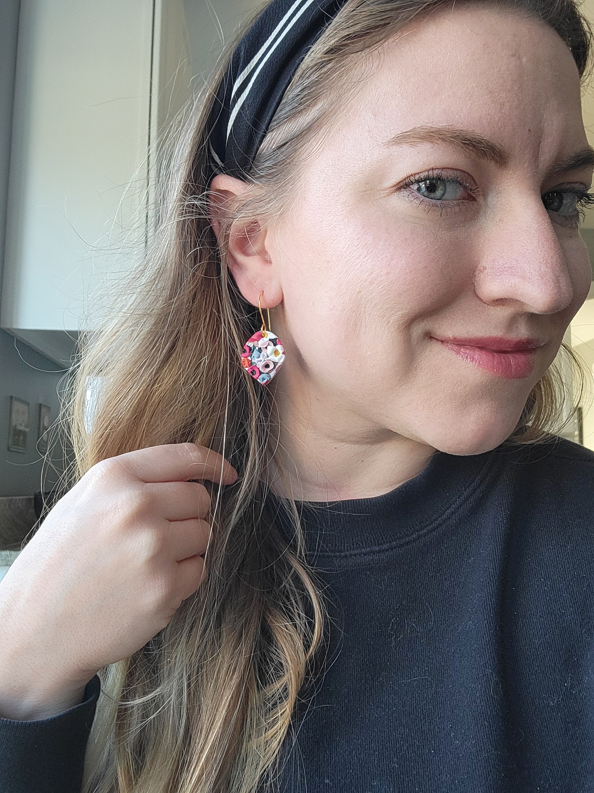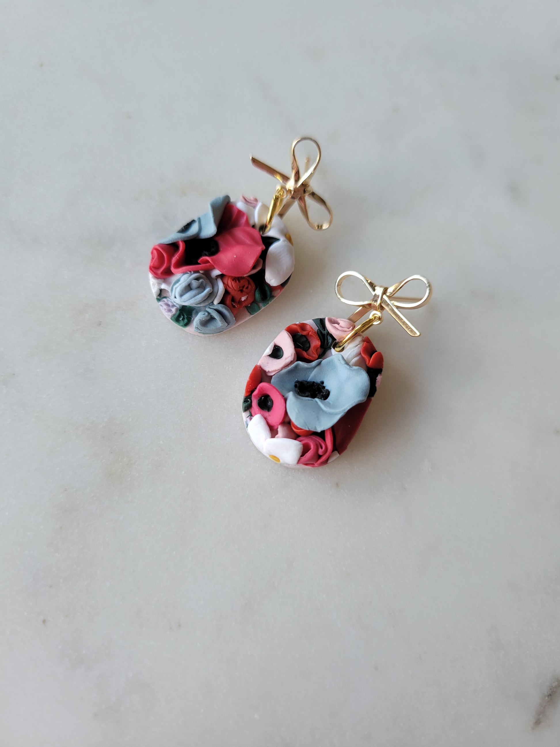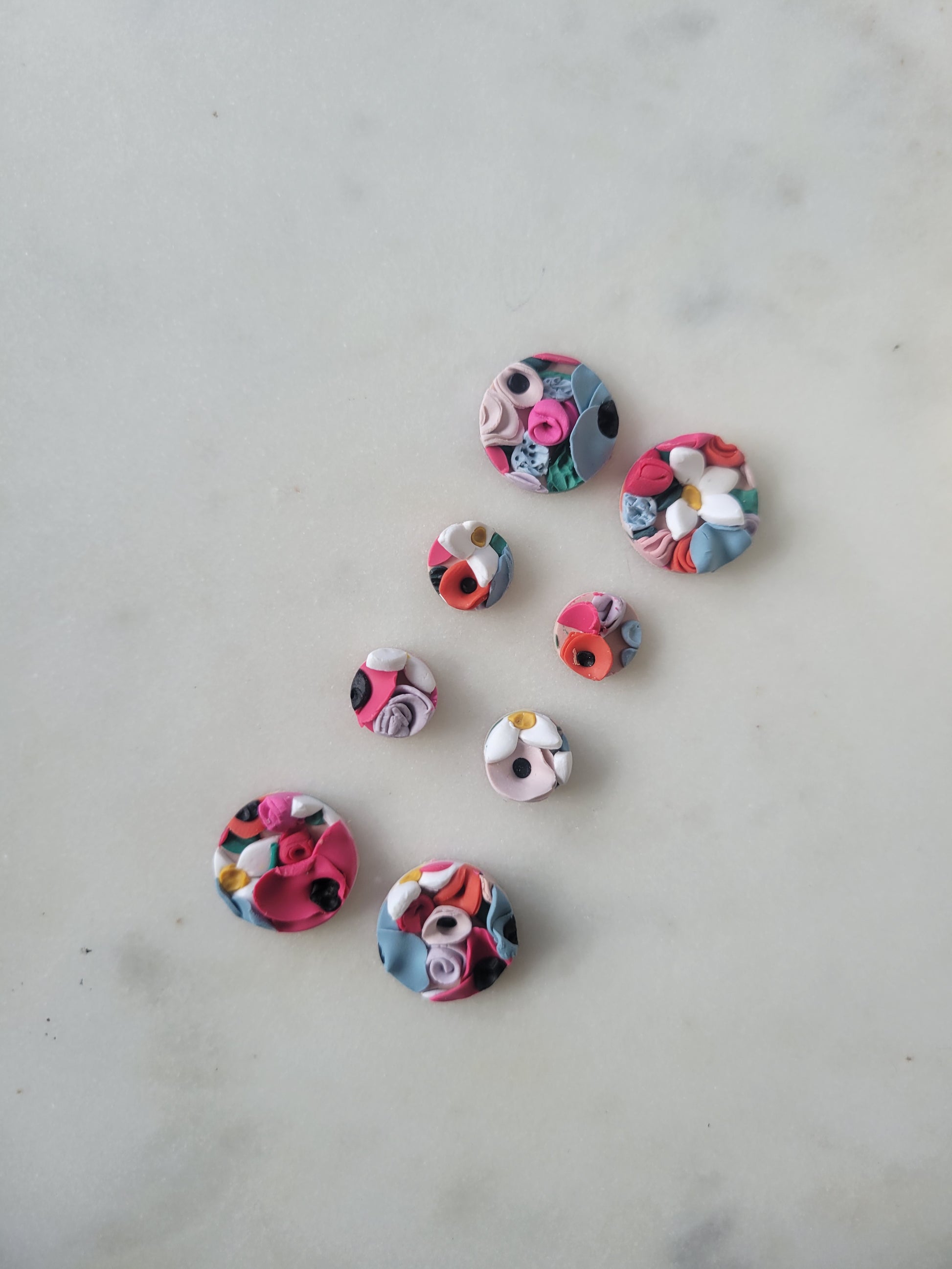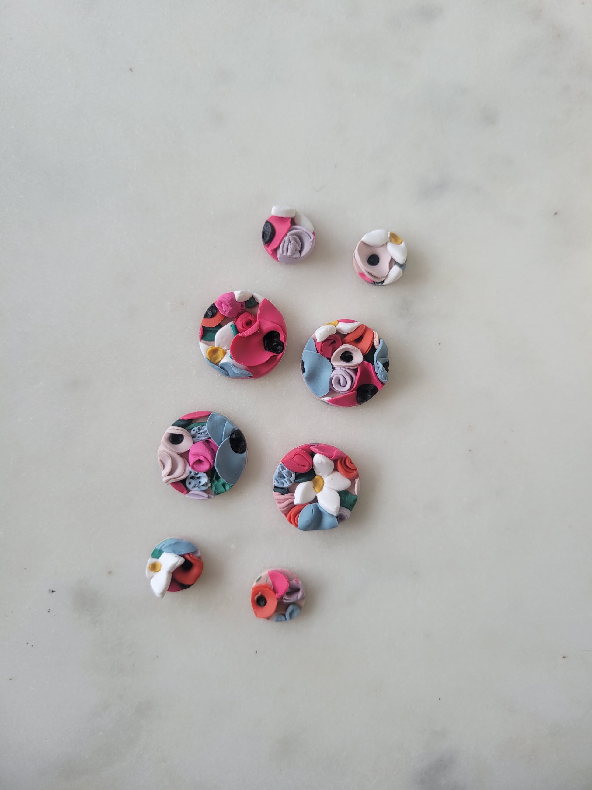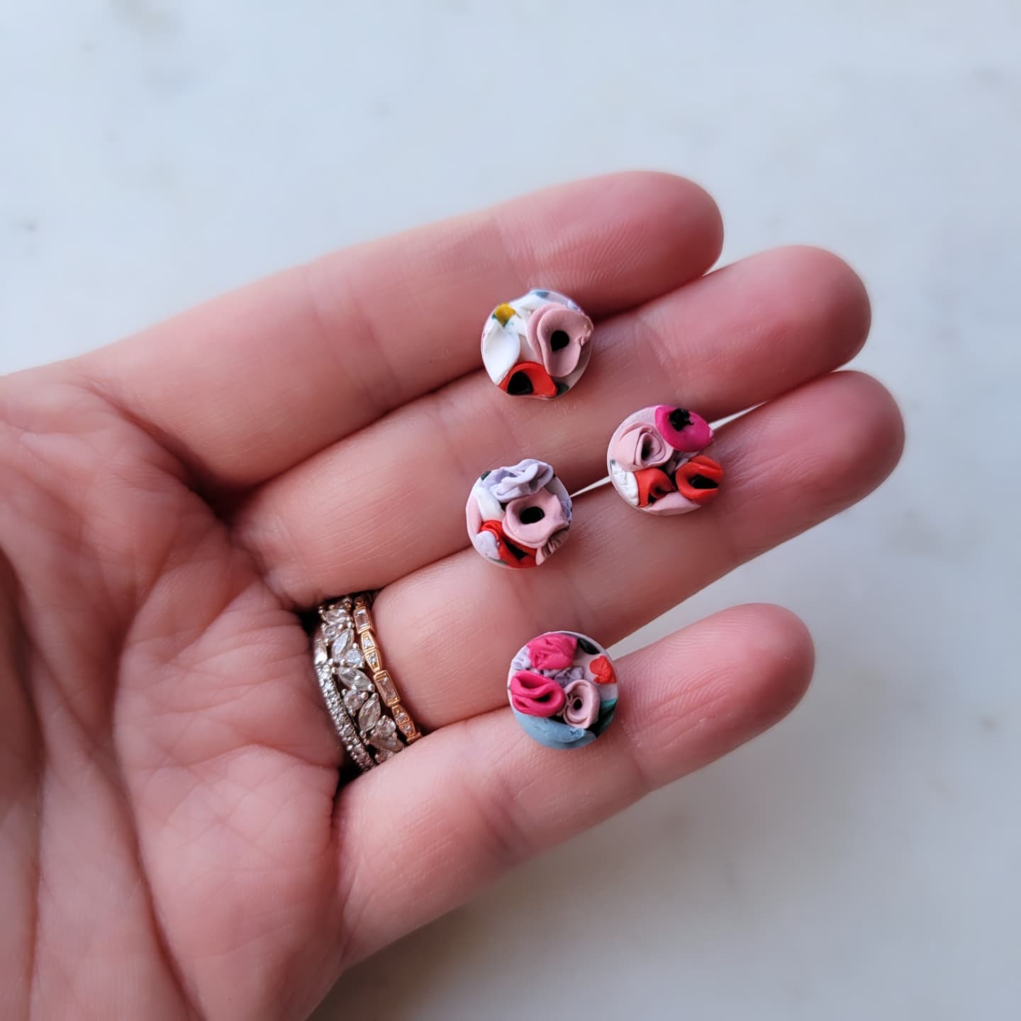 Each flower and leaf is carefully handcrafted on a single clay slab and cut into three different styles of earrings.
