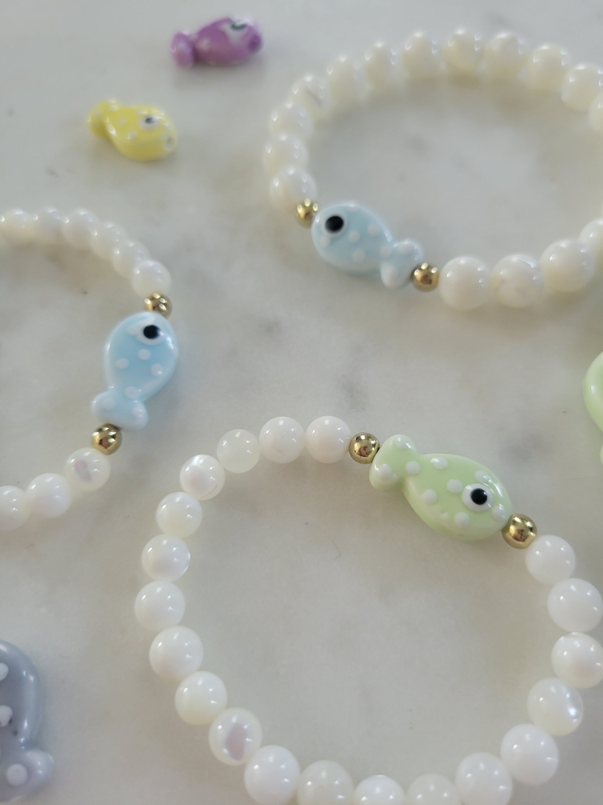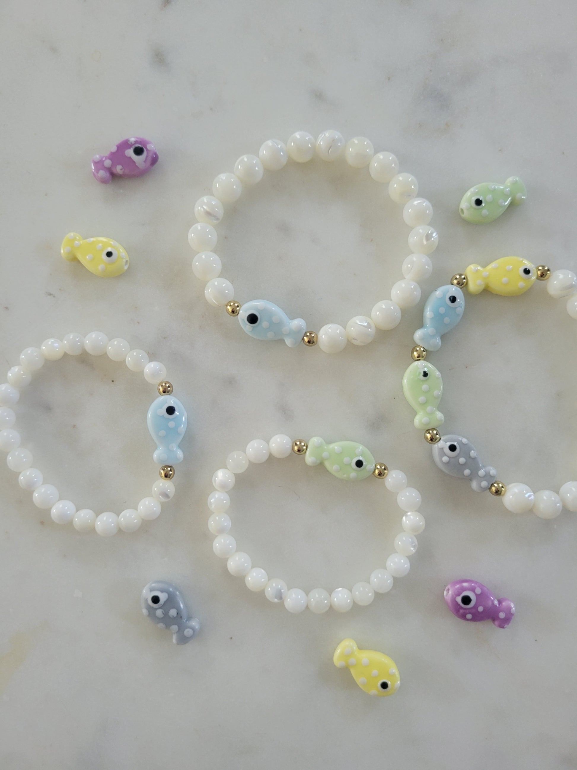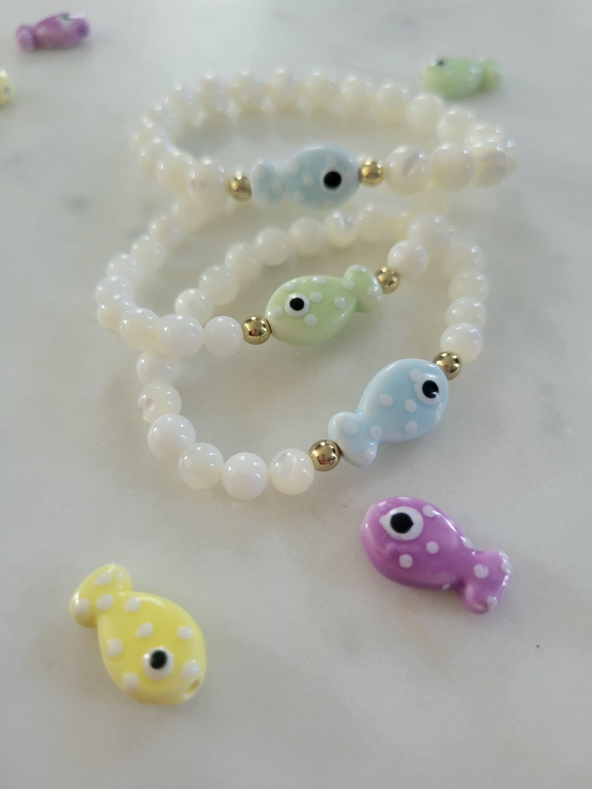 This eye catching mother of pearl bracelet features a busy little ceramic fish as the focal point. The bracelet is accented by hematite beads (metal free).