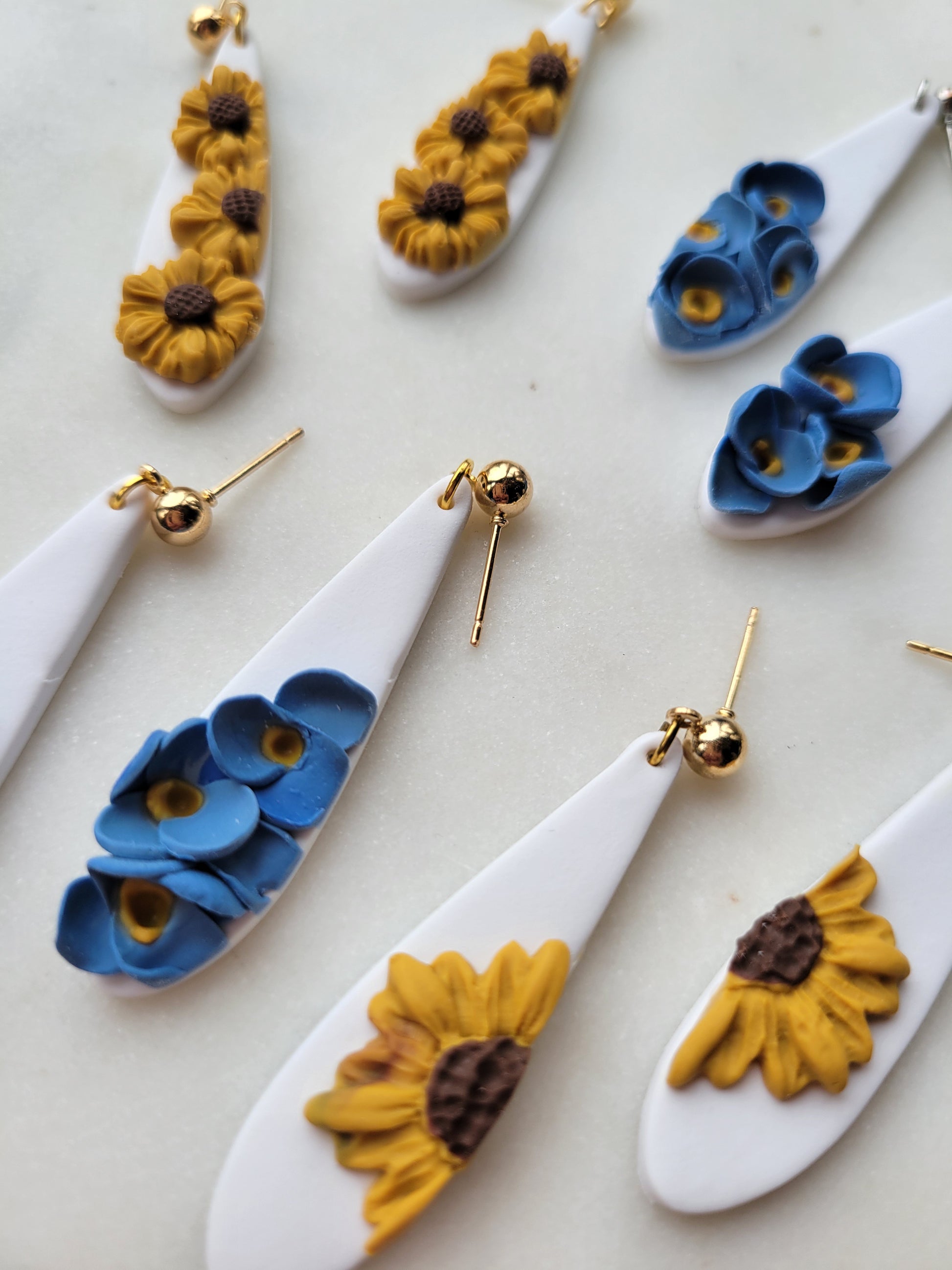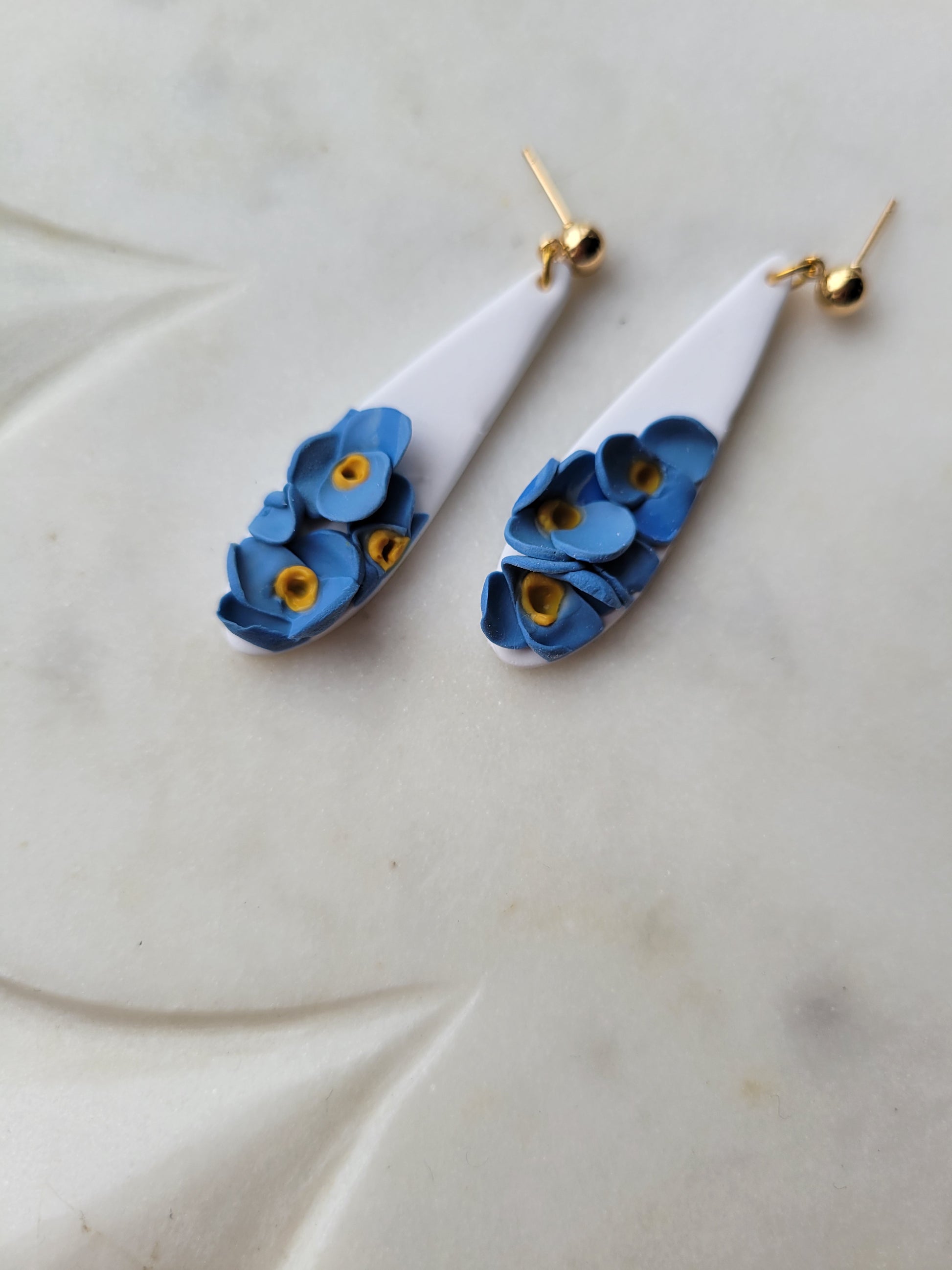 Freya- where dainty meets dramatic! Handmade from lightweight polymer clay, these earrings showcase elegant teardrop shapes with handcrafted forget me nots.