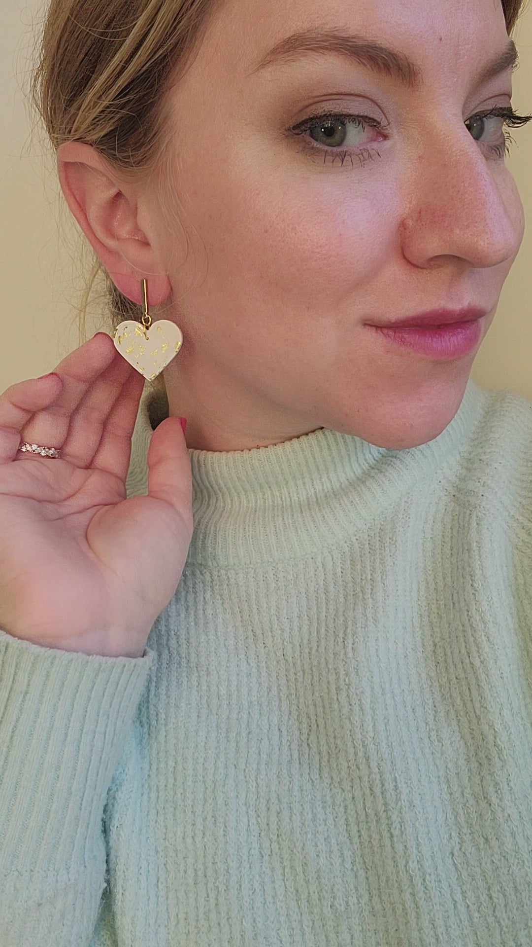Dangling hearts dropping from a brass bar post, these earrings are eye catching.