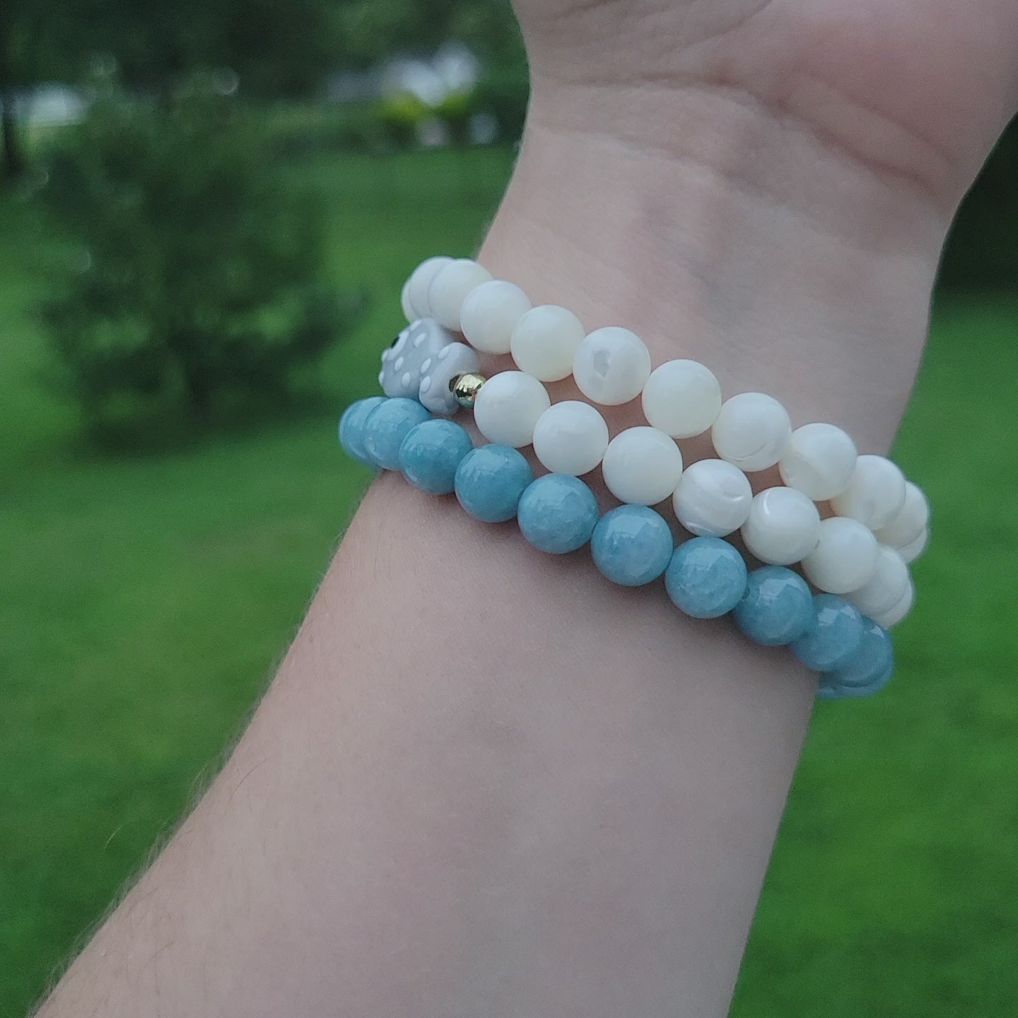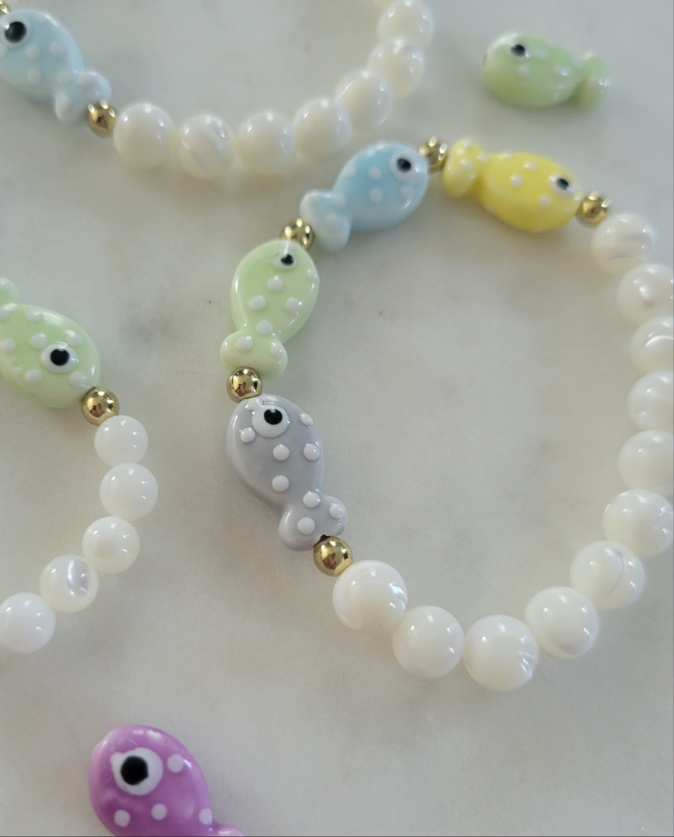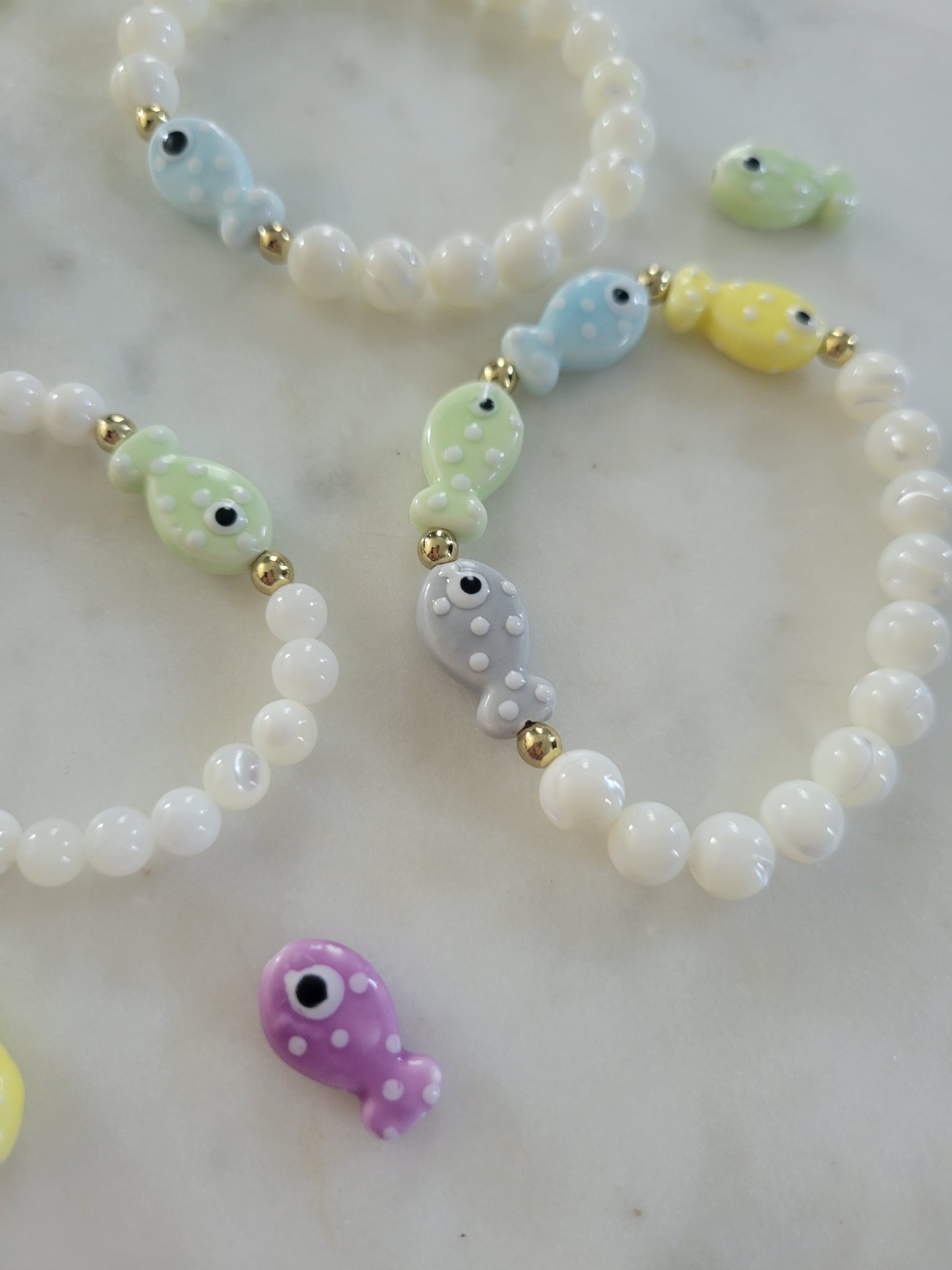 This gorgeous mother of pearl bracelet features four pastel fish as the focal point. It's accented by hematite beads and is made to wear alone or in a stack with other fishy friends.