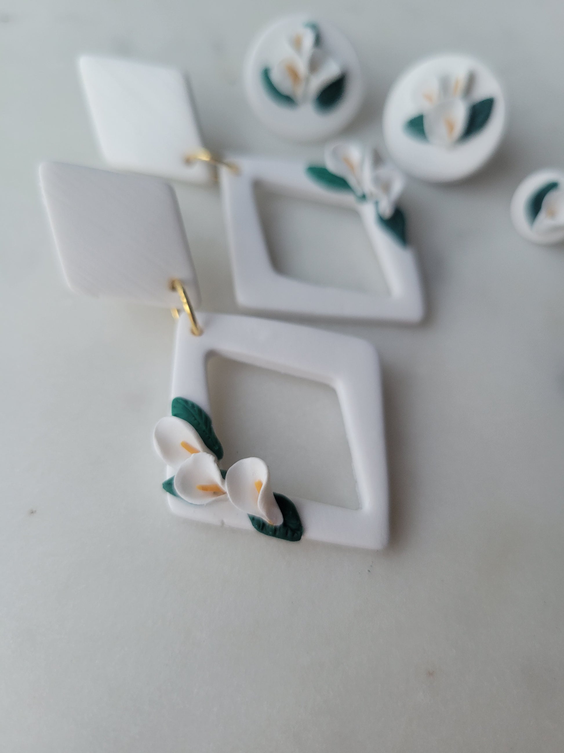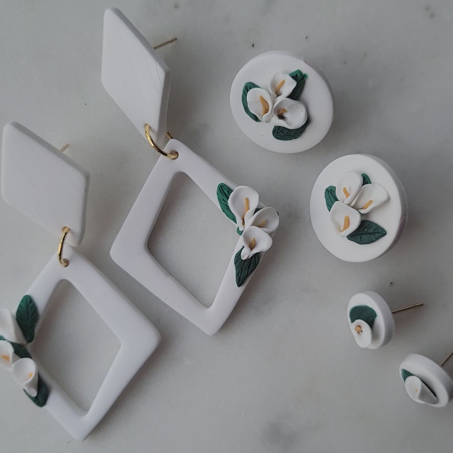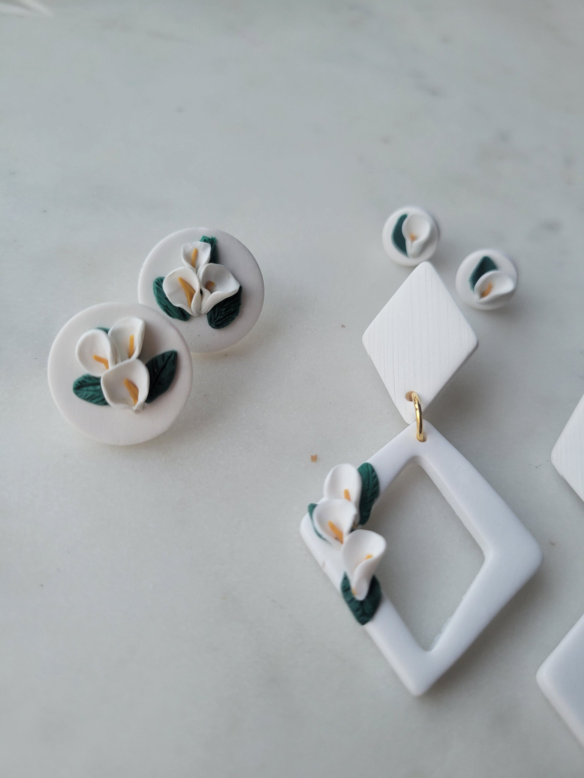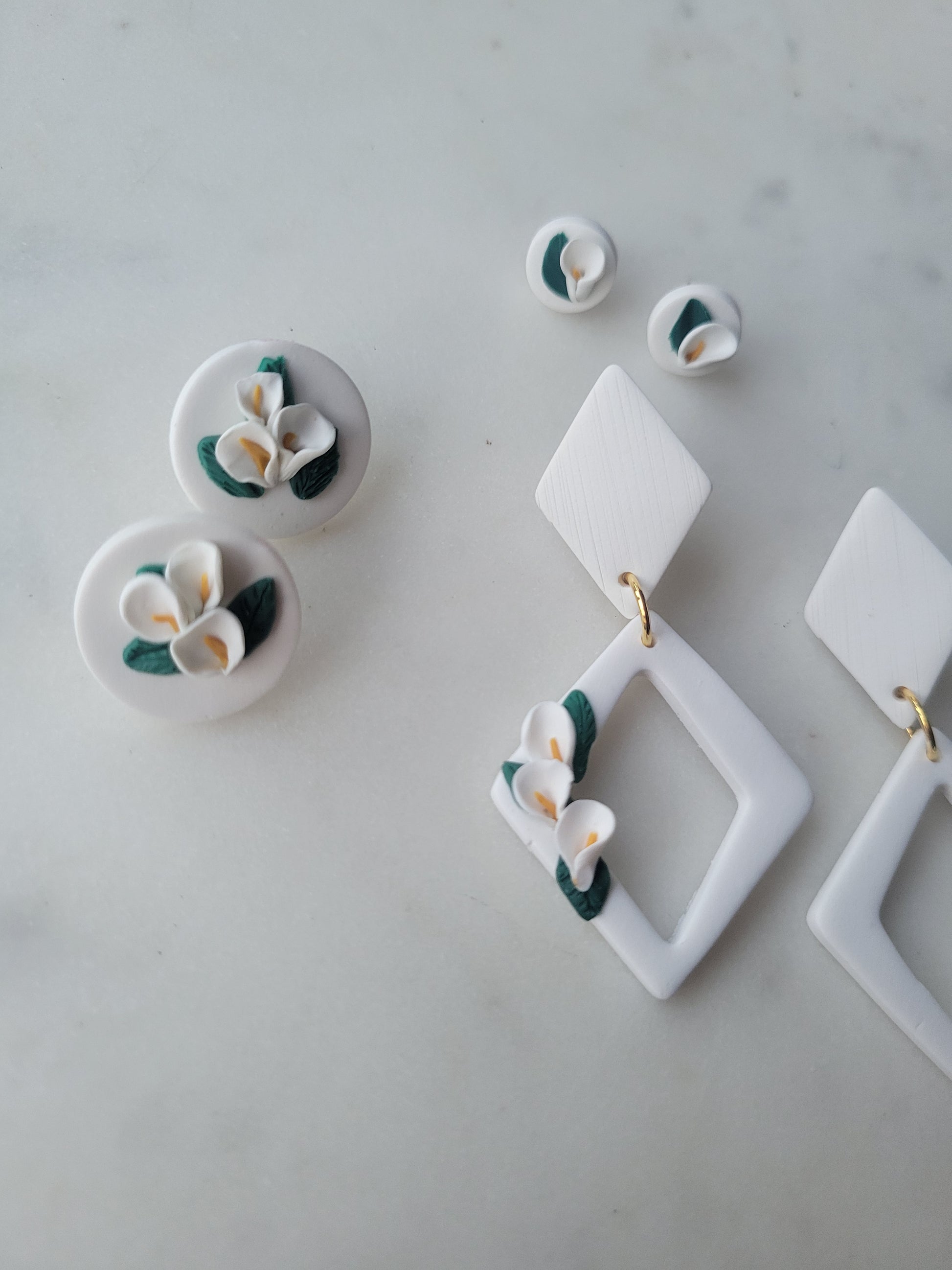 Each flower and leaf is carefully handcrafted on a single clay slab and cut into three different styles of earrings.