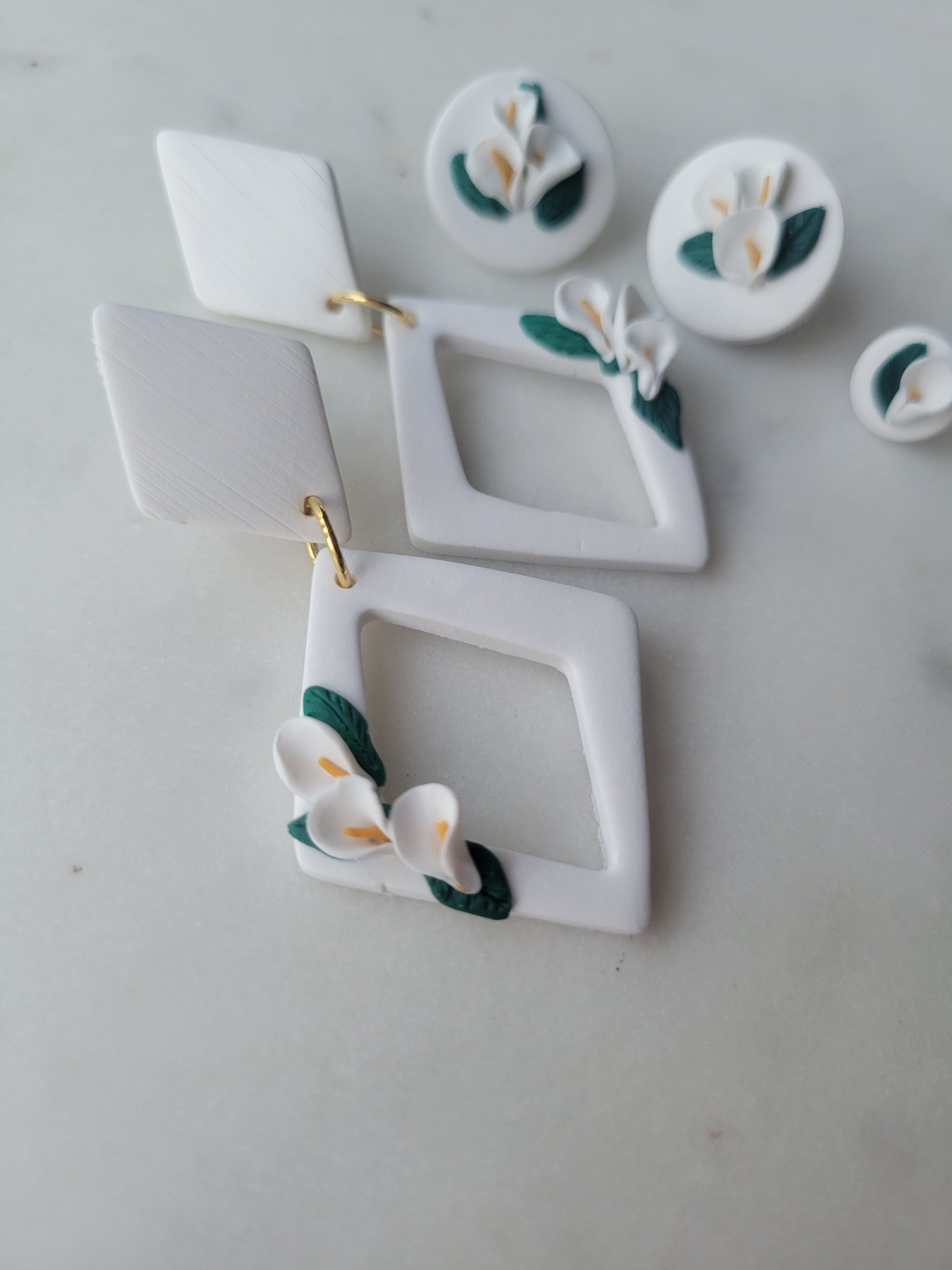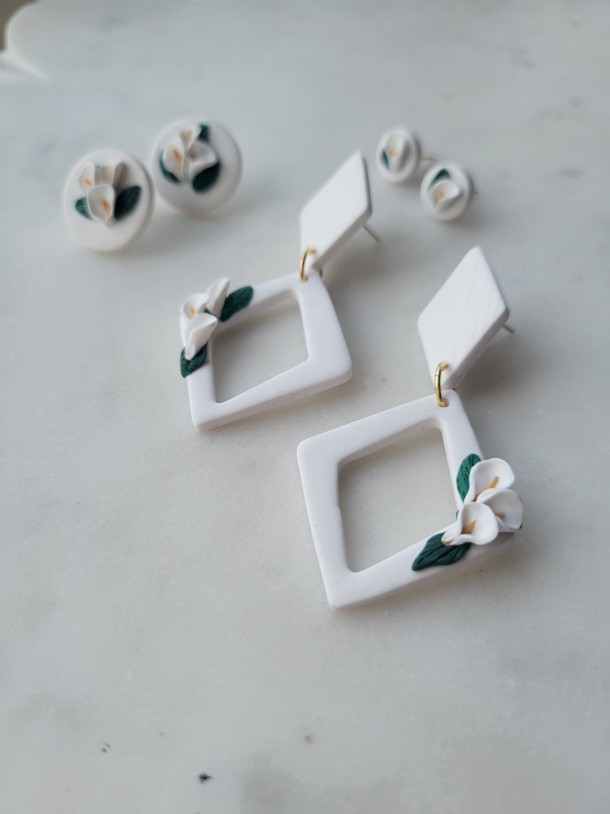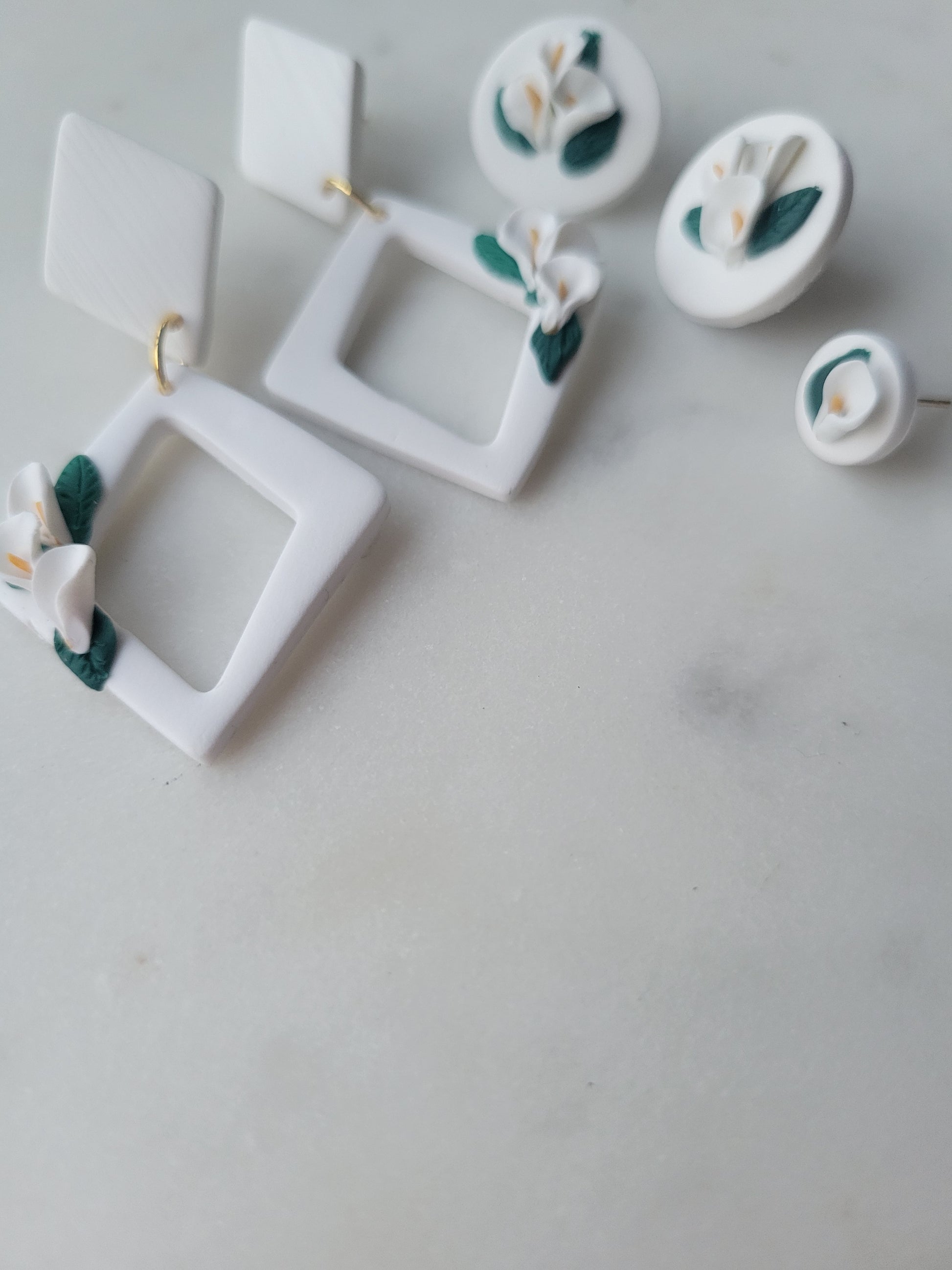 Each flower and leaf is carefully handcrafted on a single clay slab and cut into three different styles of earrings.