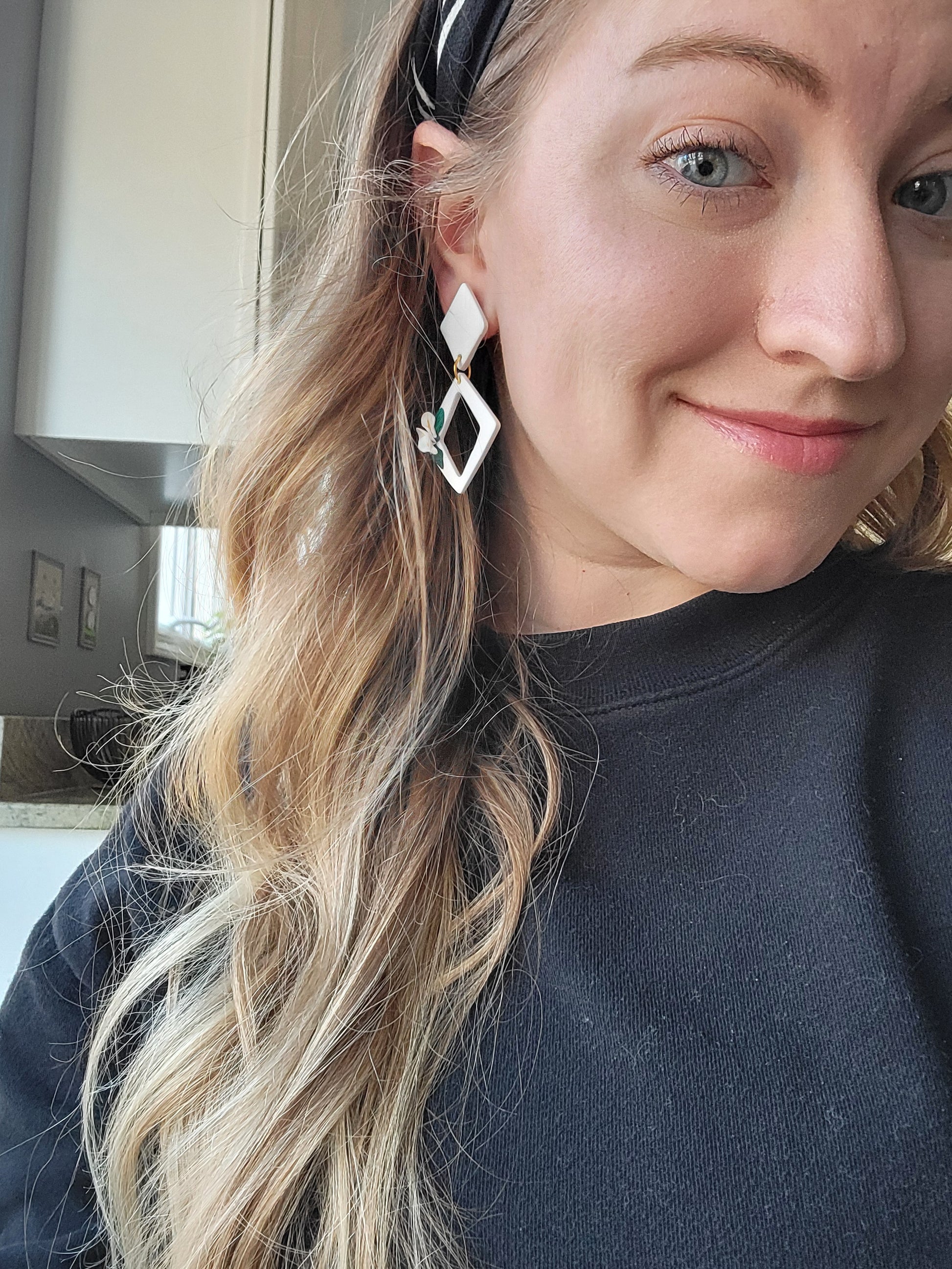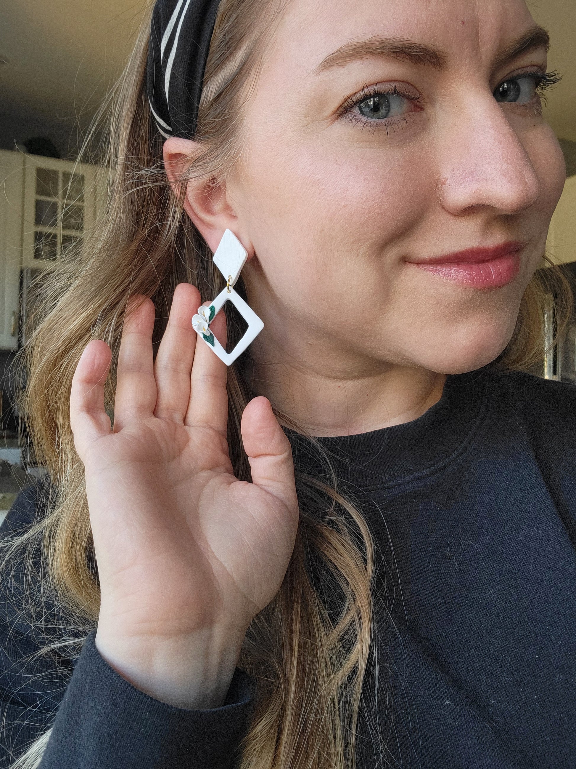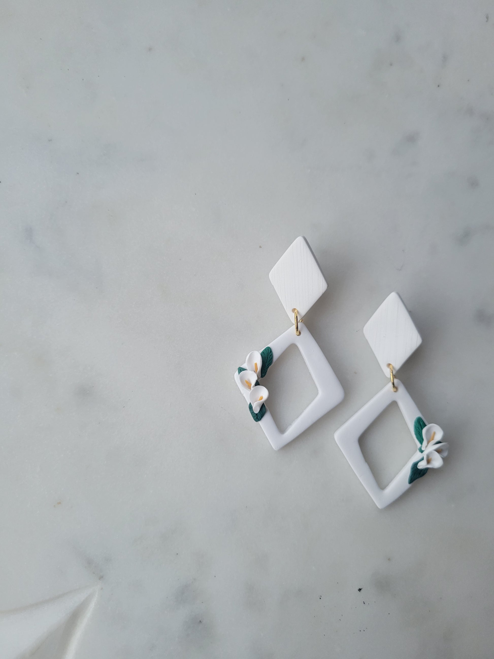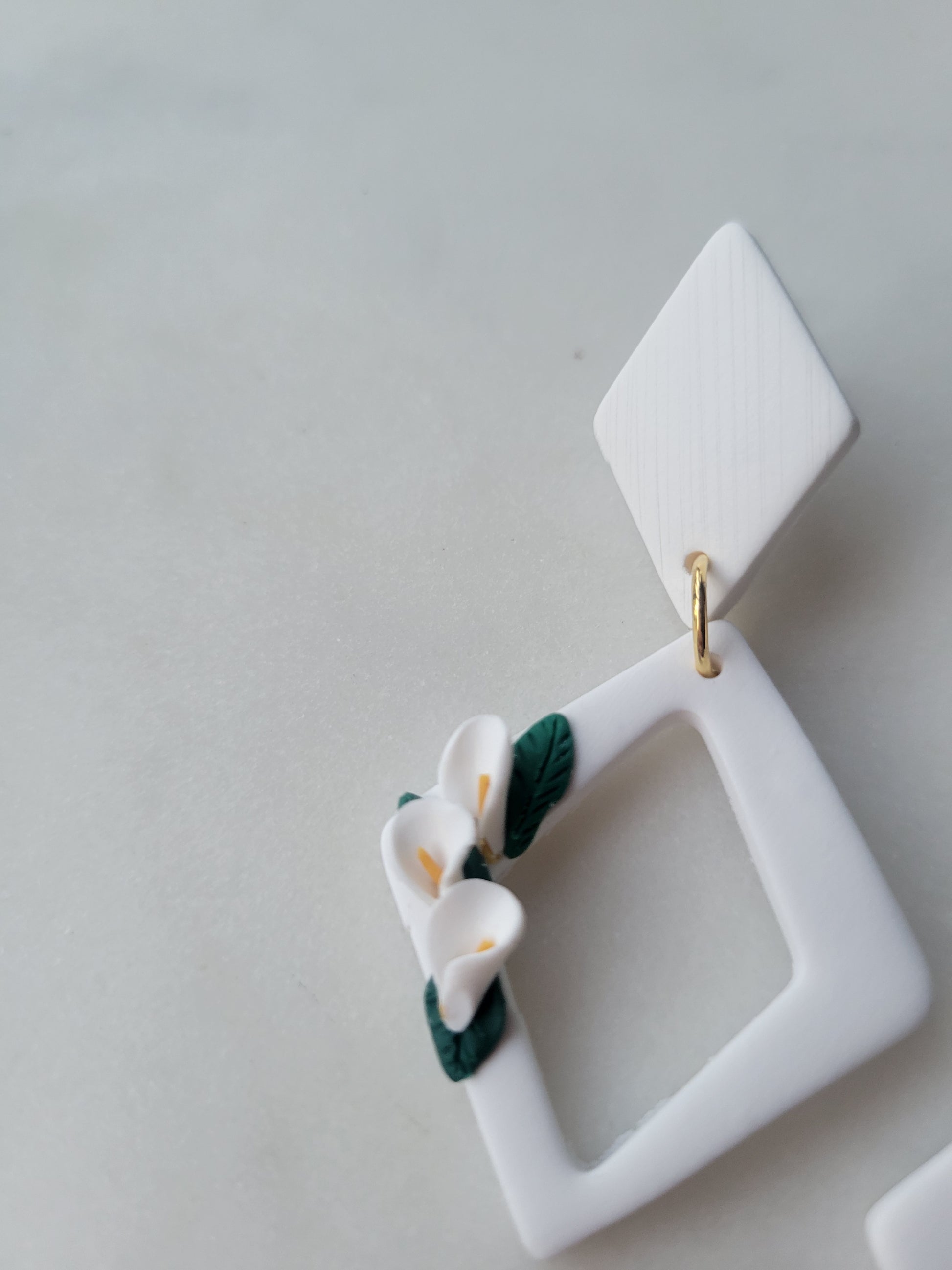 Each flower and leaf is carefully handcrafted on a single clay slab and cut into three different styles of earrings.