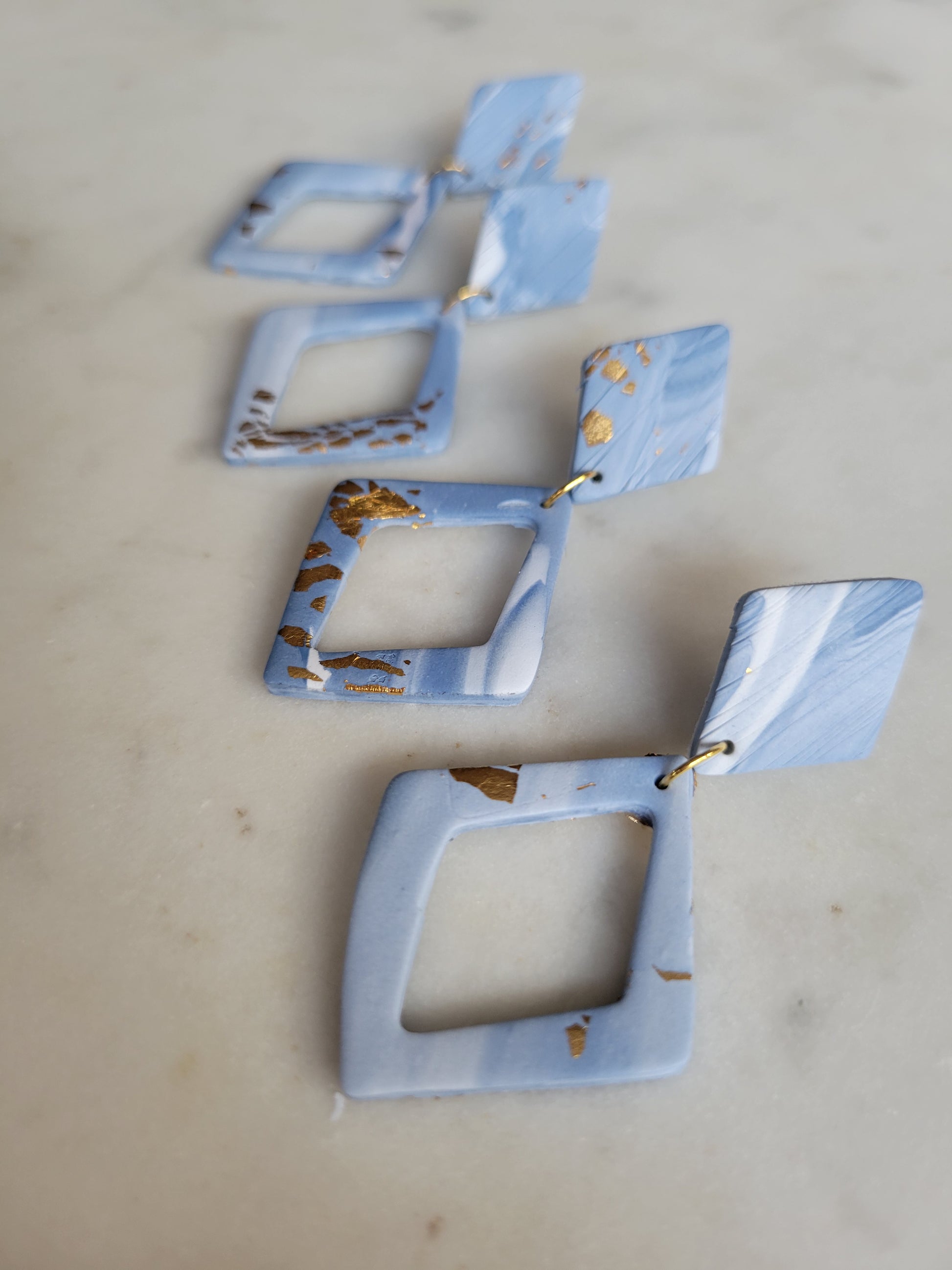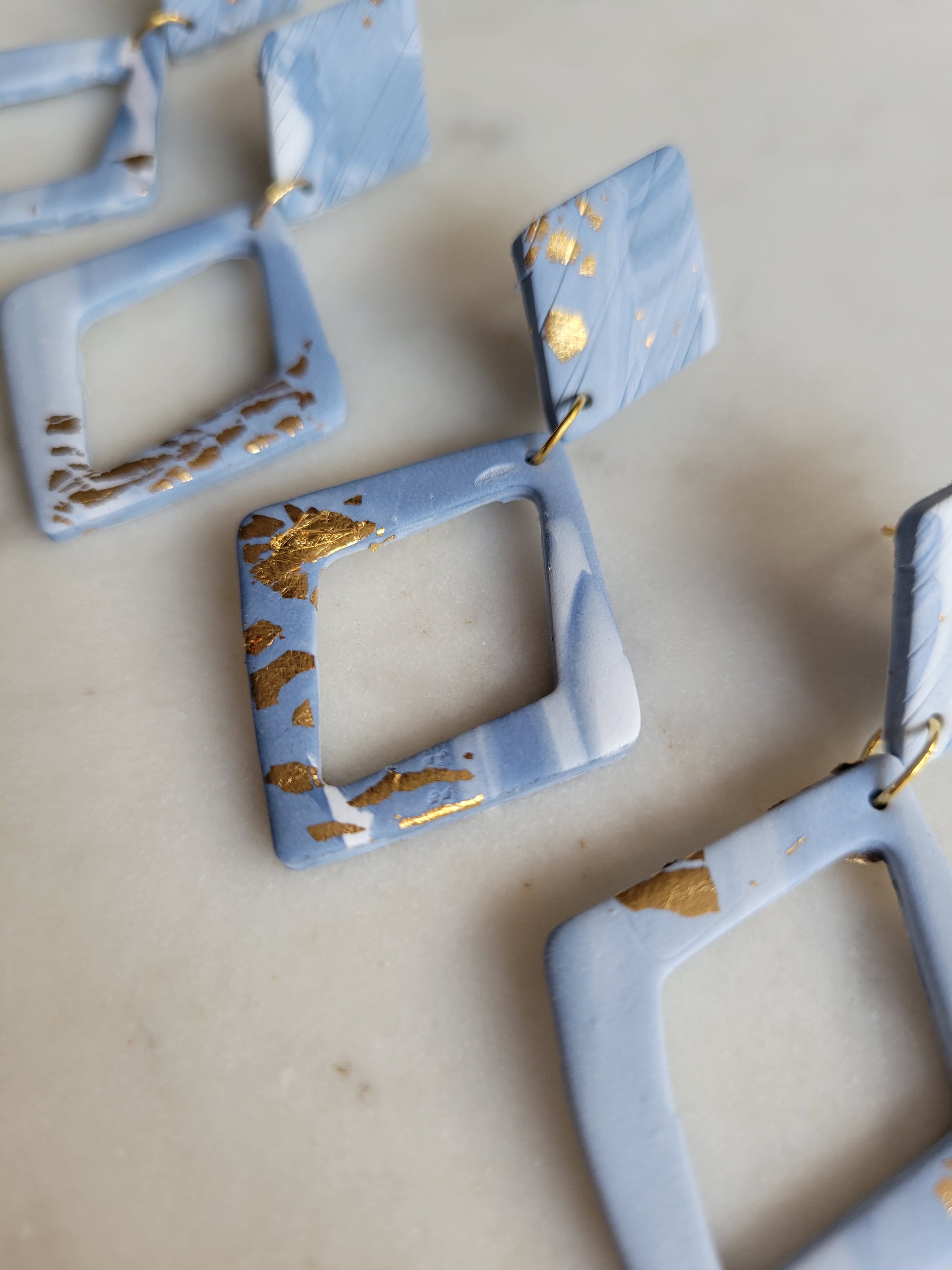 This dusty blue colored style is swirled with white for a feminine but bold statement. Speckled throughout with gold leaf.