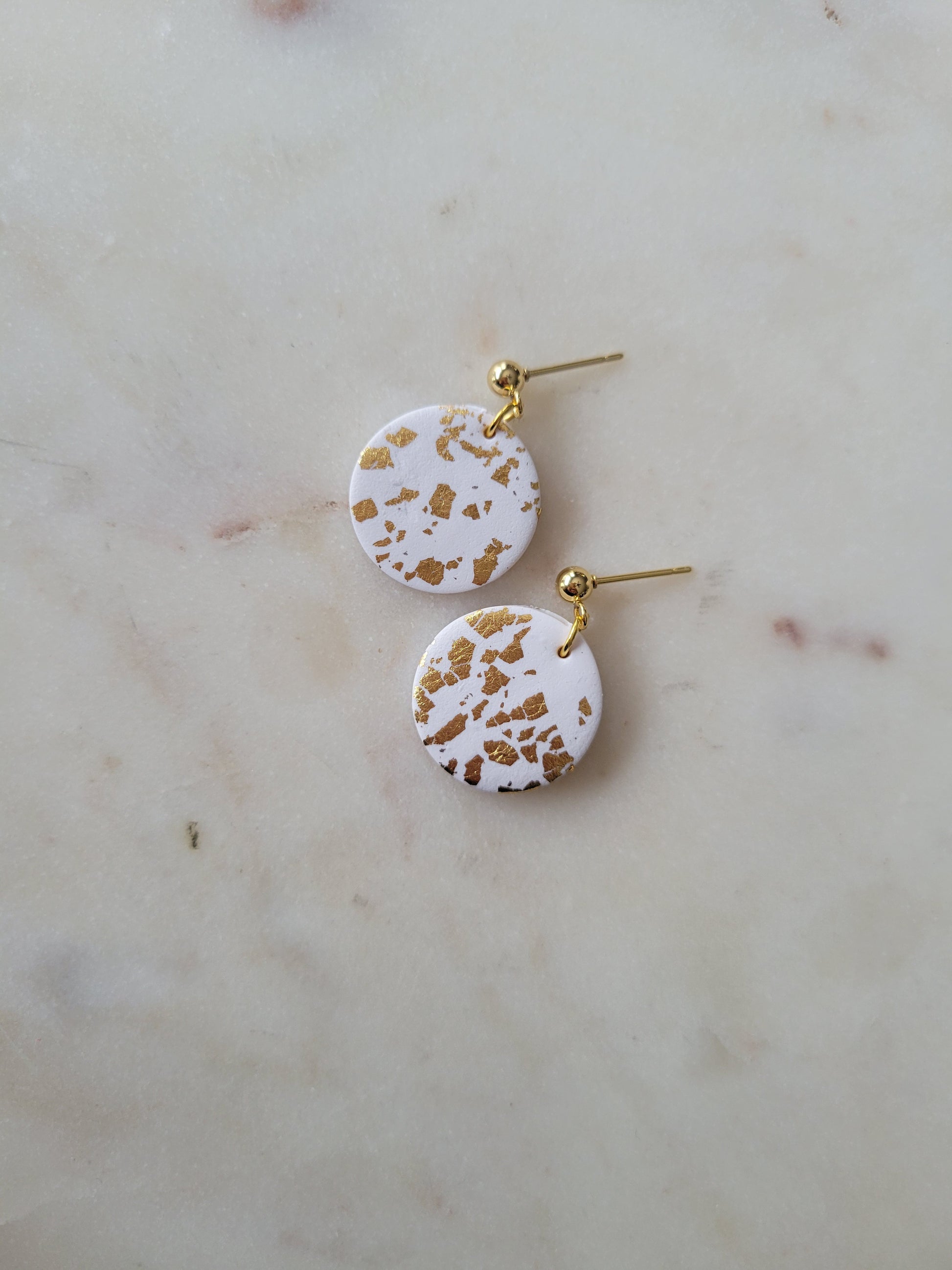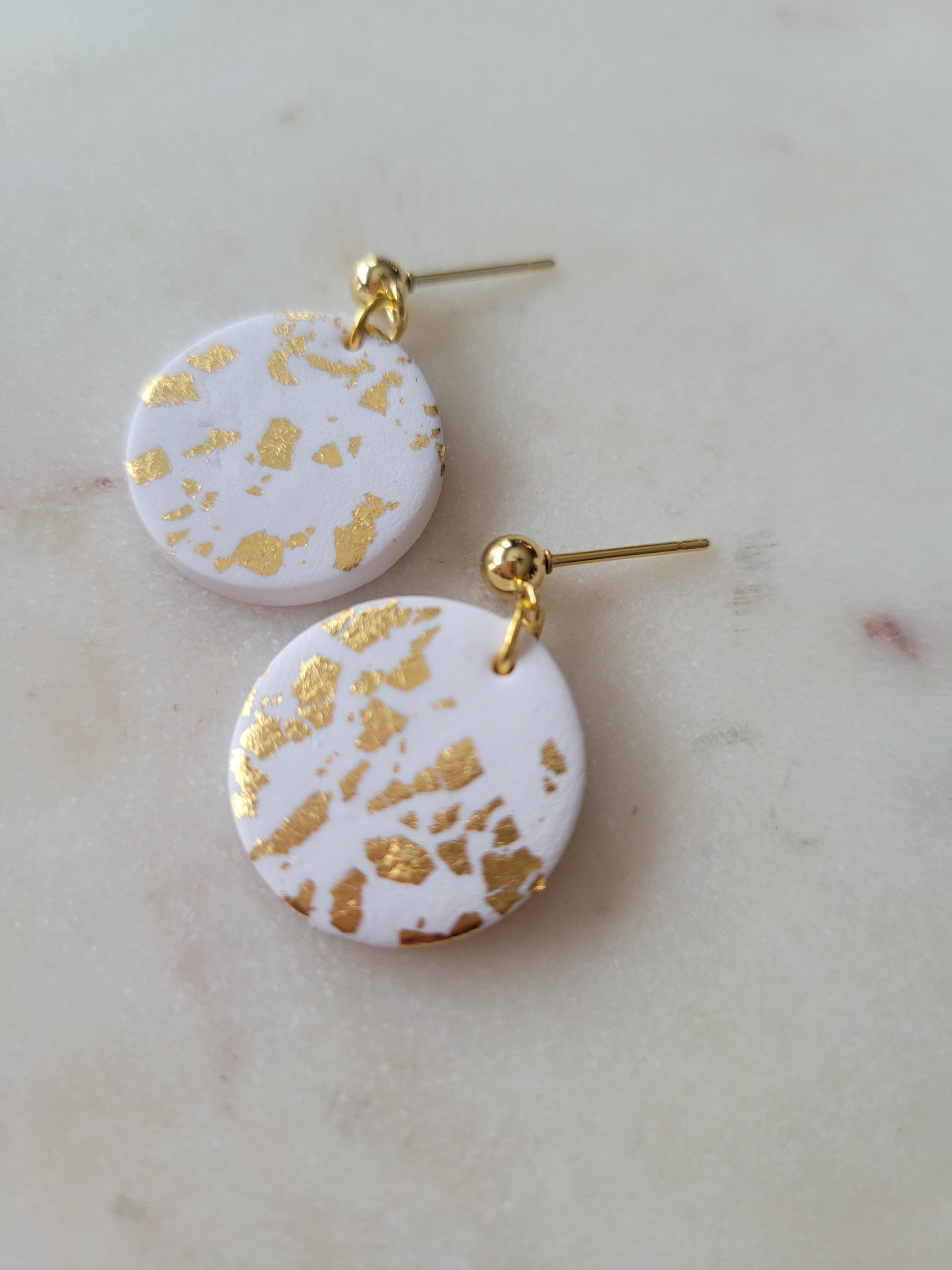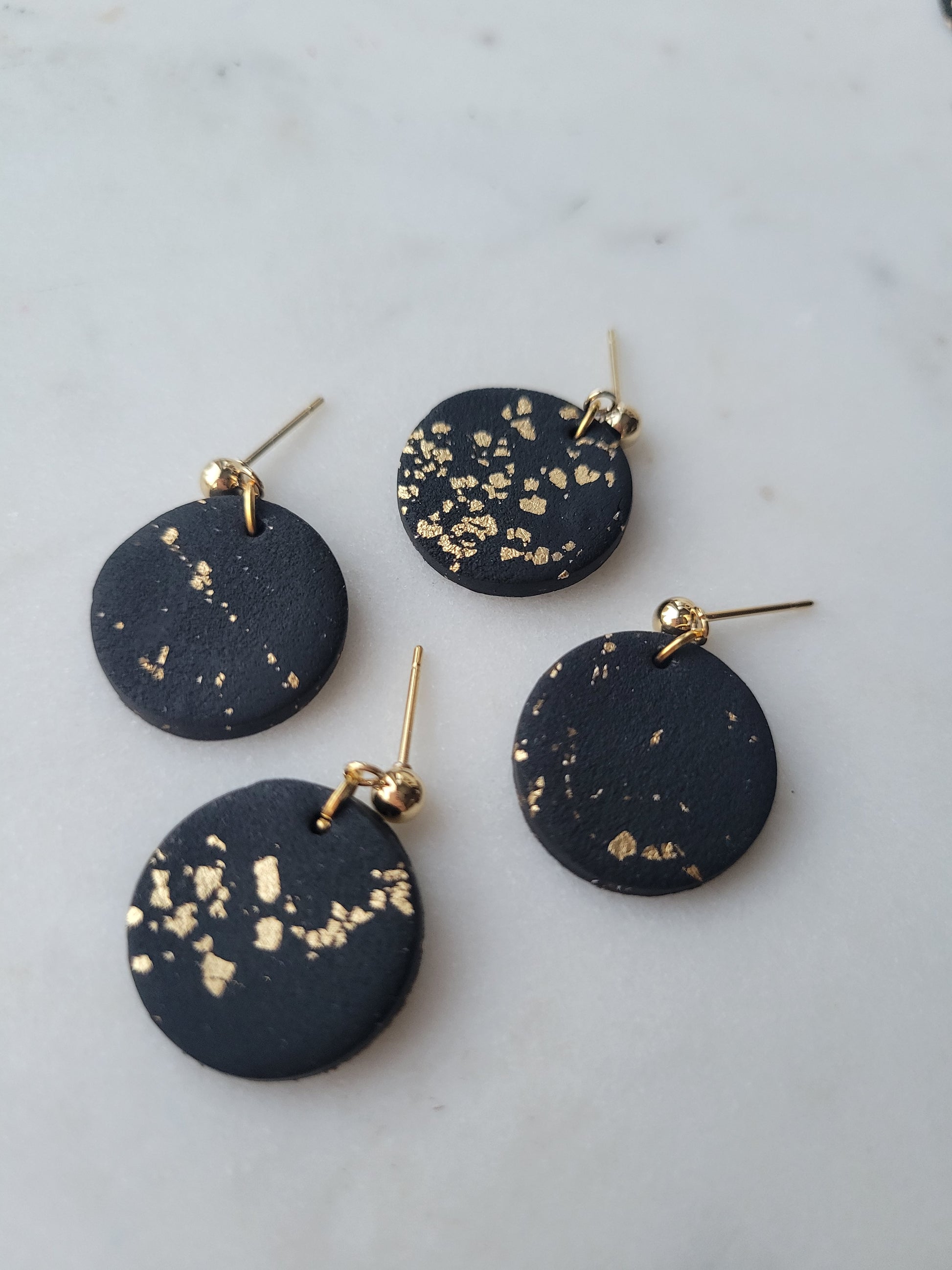 These little circle dangles are about the size of a nickle. These earrings have gold leaf speckled throughout looking like a sparkly sky.