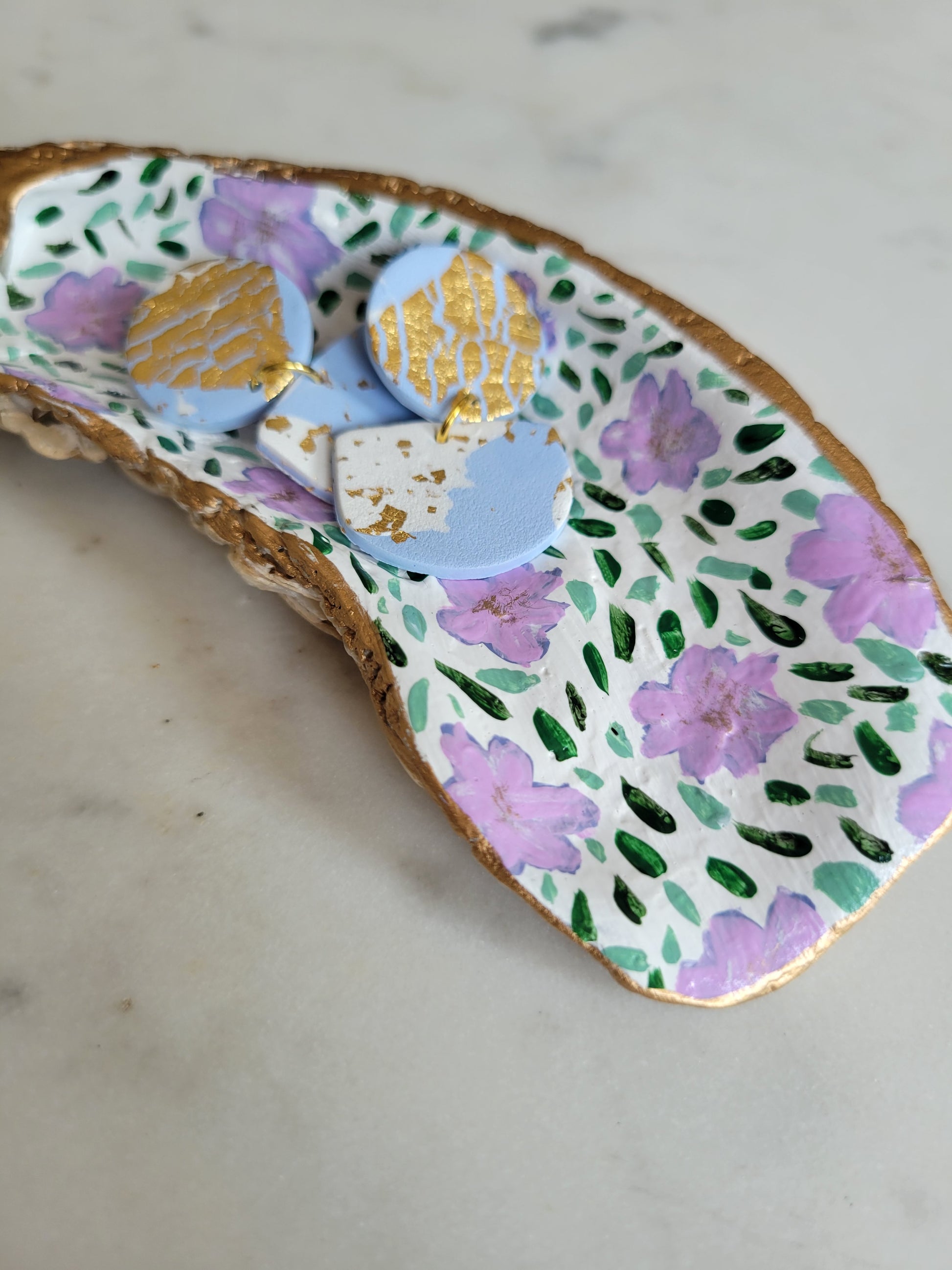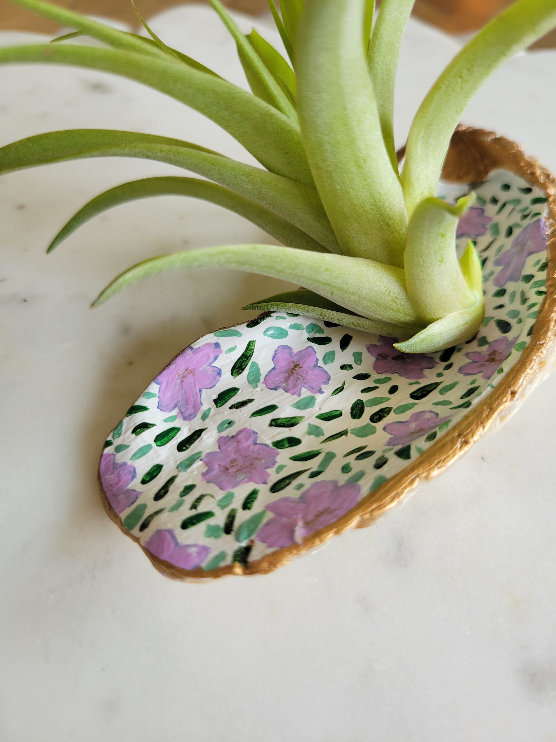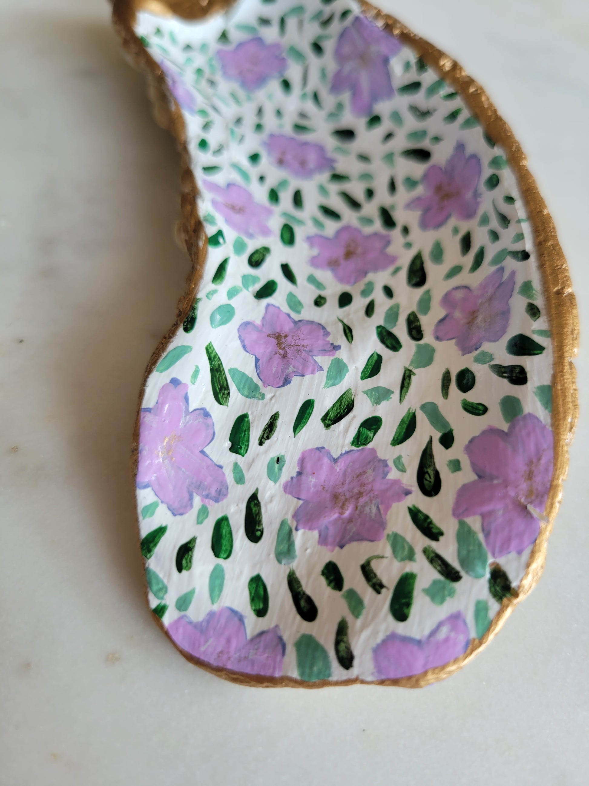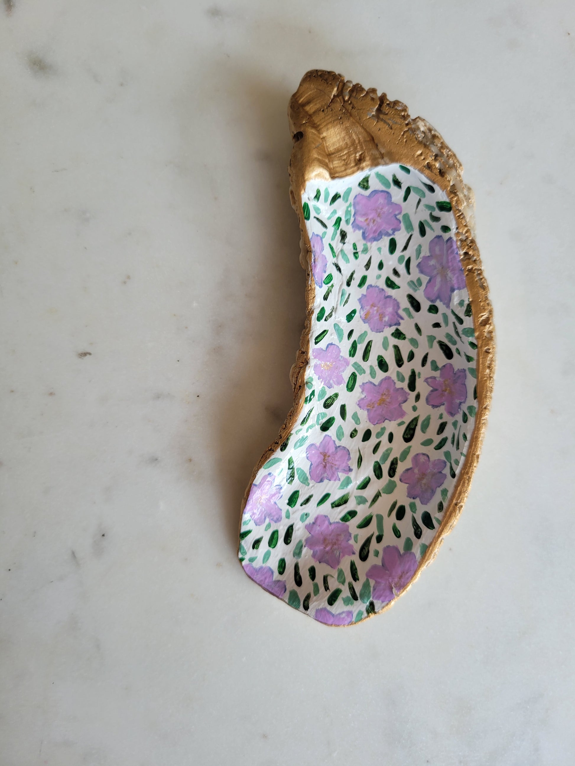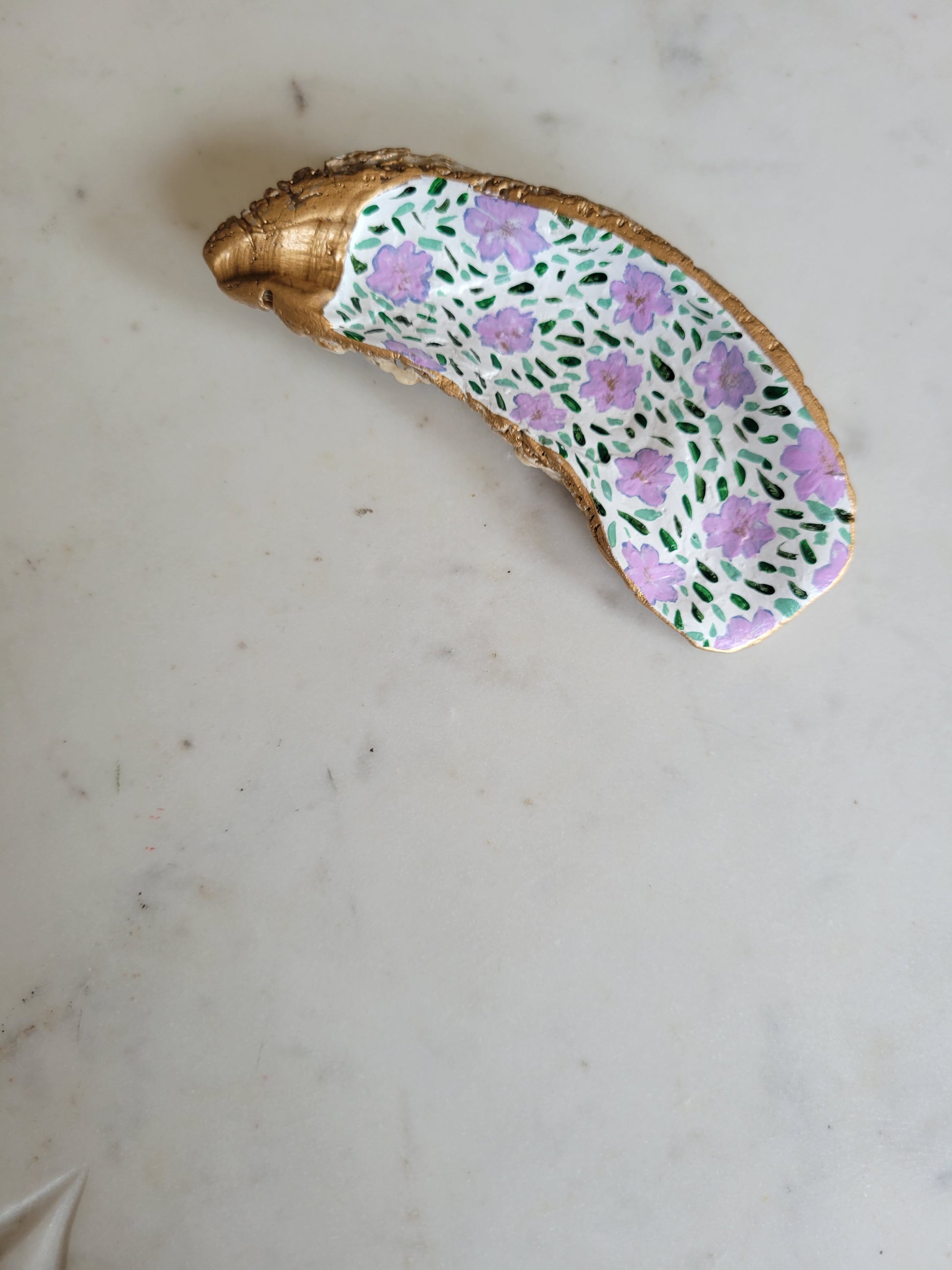 Oyster Shell Catch-All Dish: Handpainted Lavender Florals (Gold Embellishment)