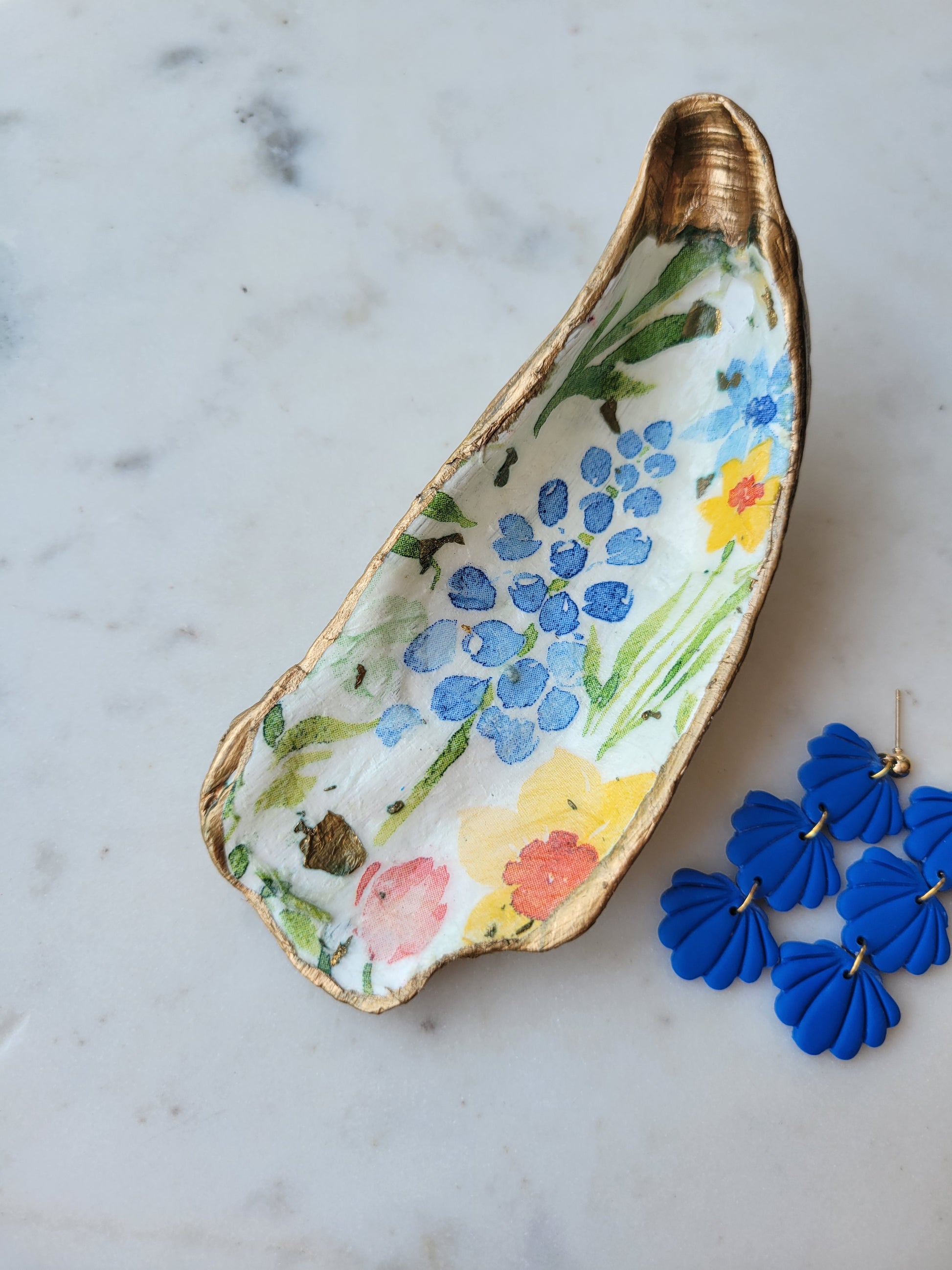 The dish is handmade from an oyster shell found on the beach in the Outer Banks, NC. A floral print is featured on this trinket dish and the edge has a painted gold detail.