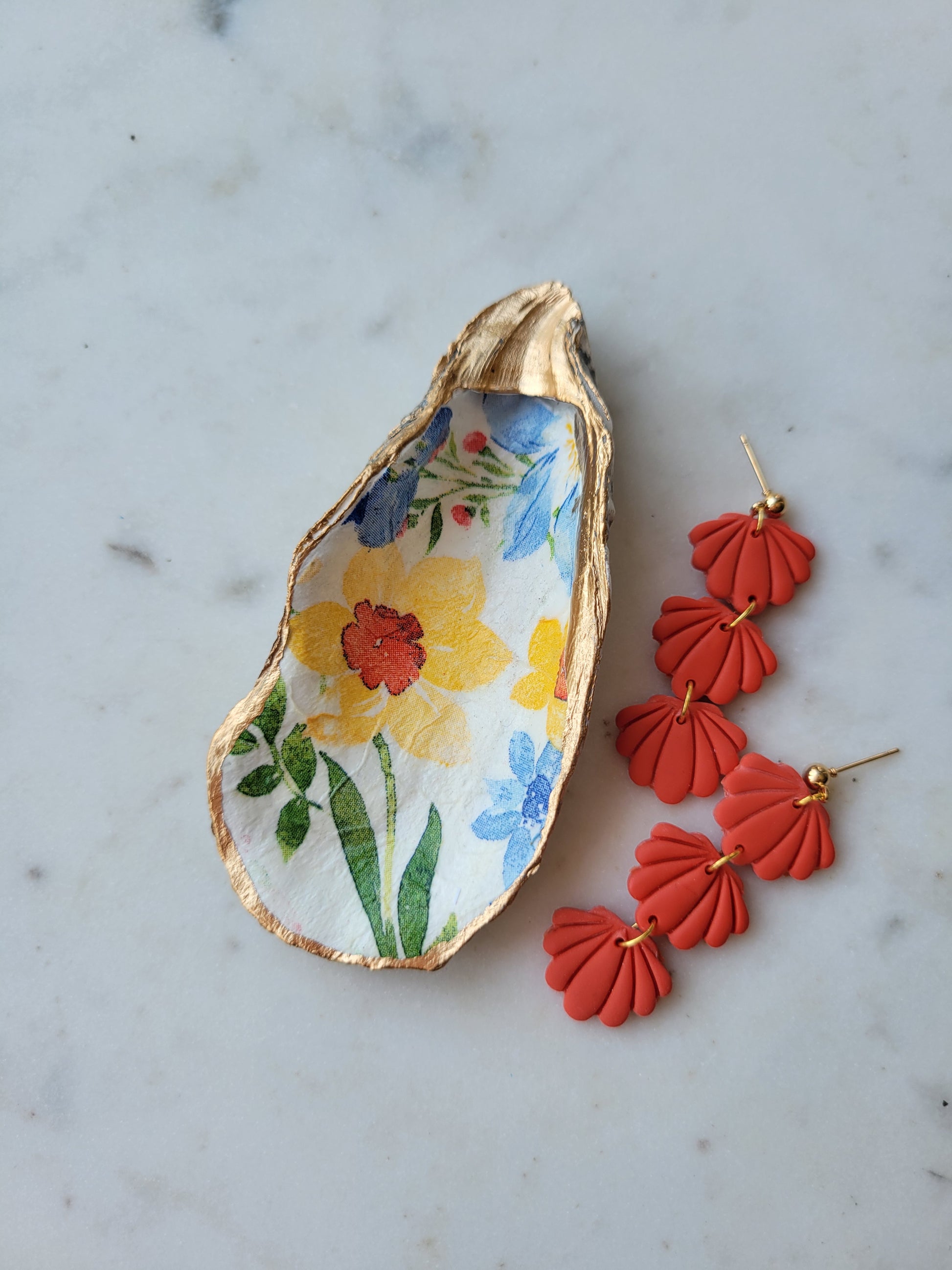 The dish is handmade from an oyster shell found on the beach in the Outer Banks, NC. A floral print is featured on this trinket dish and the edge has a painted gold detail.