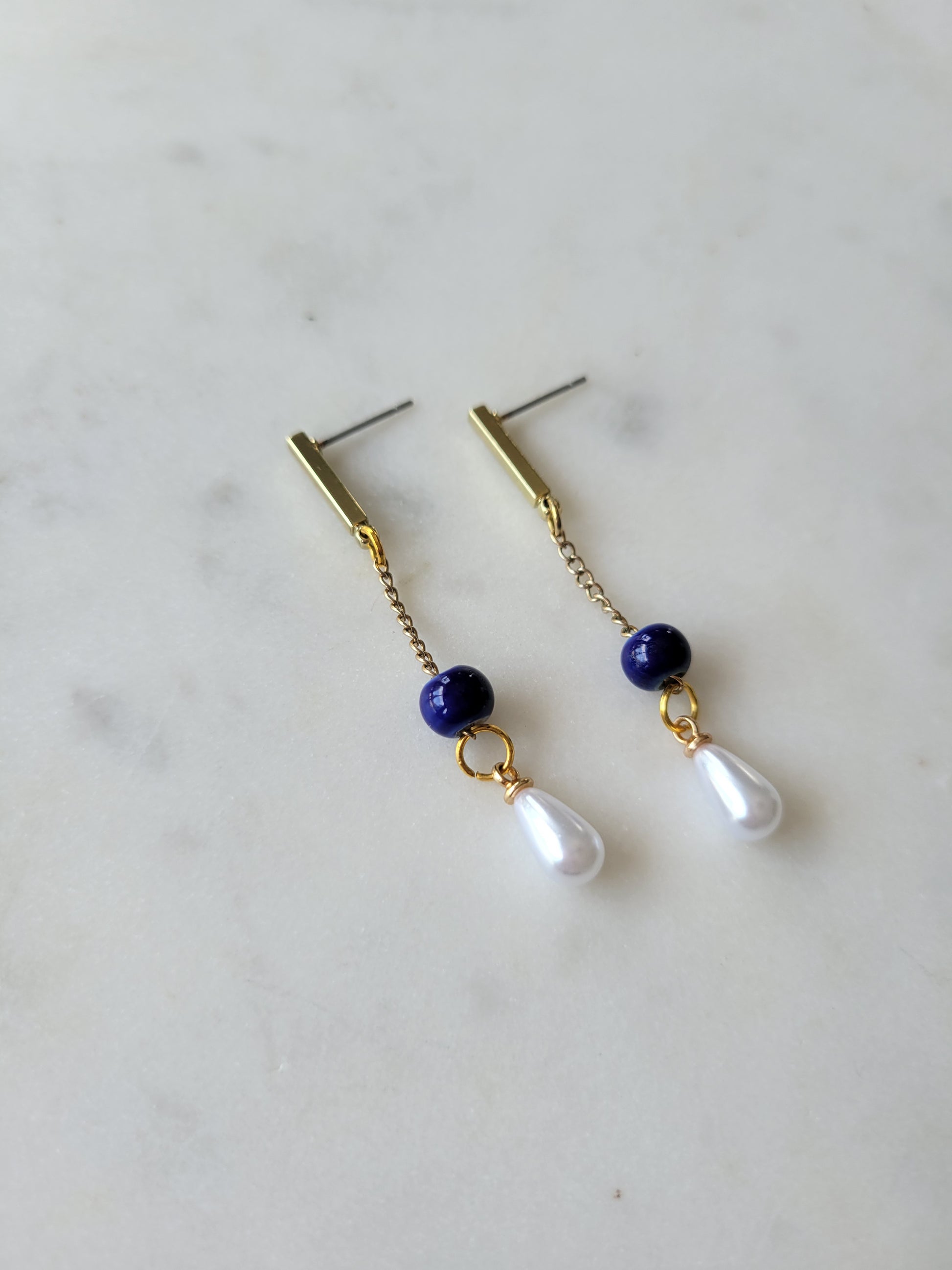 Simple but beautiful, these gold bar posts drop down to a ceramic blue bead and finish with a pearl (faux).