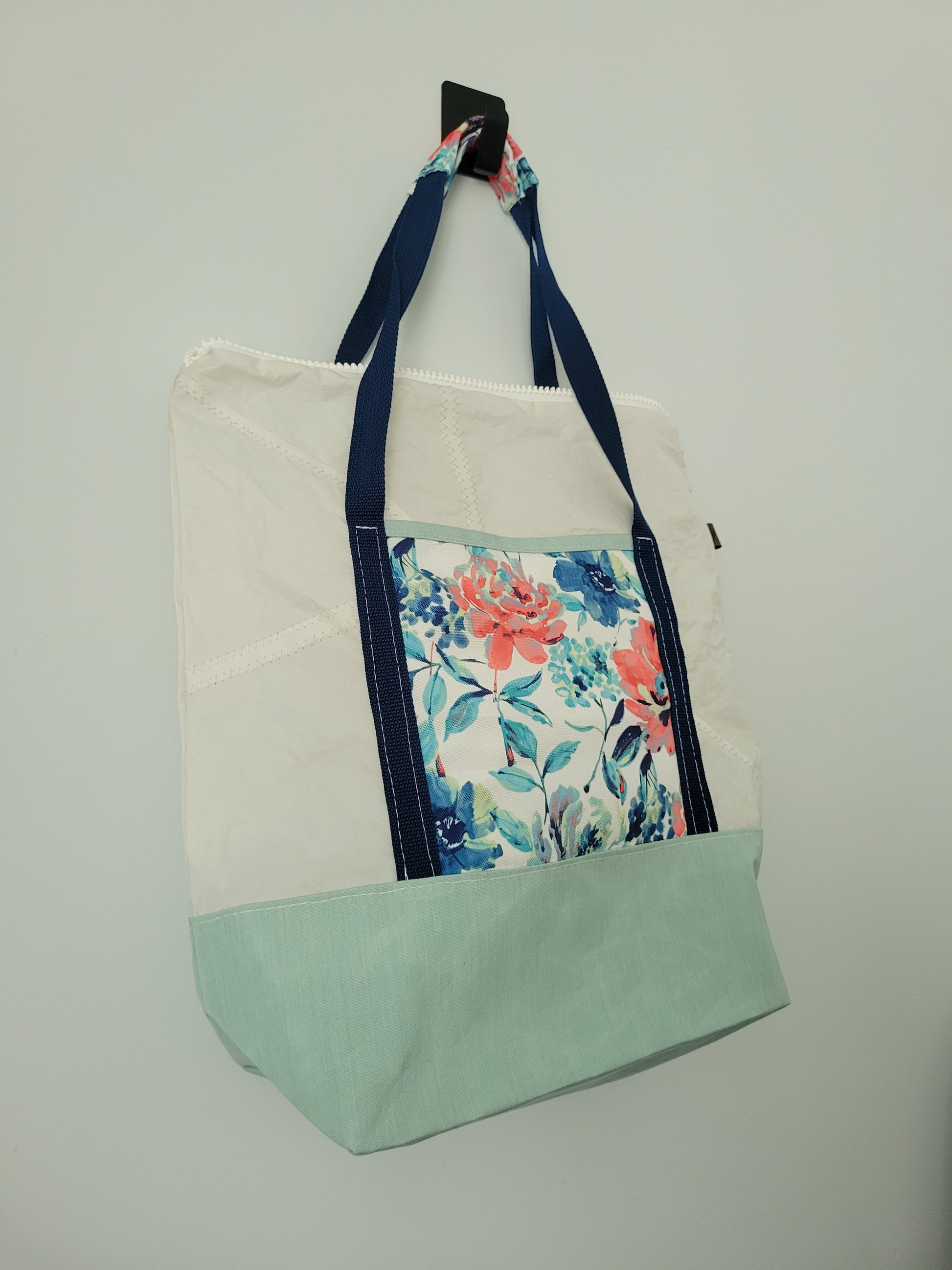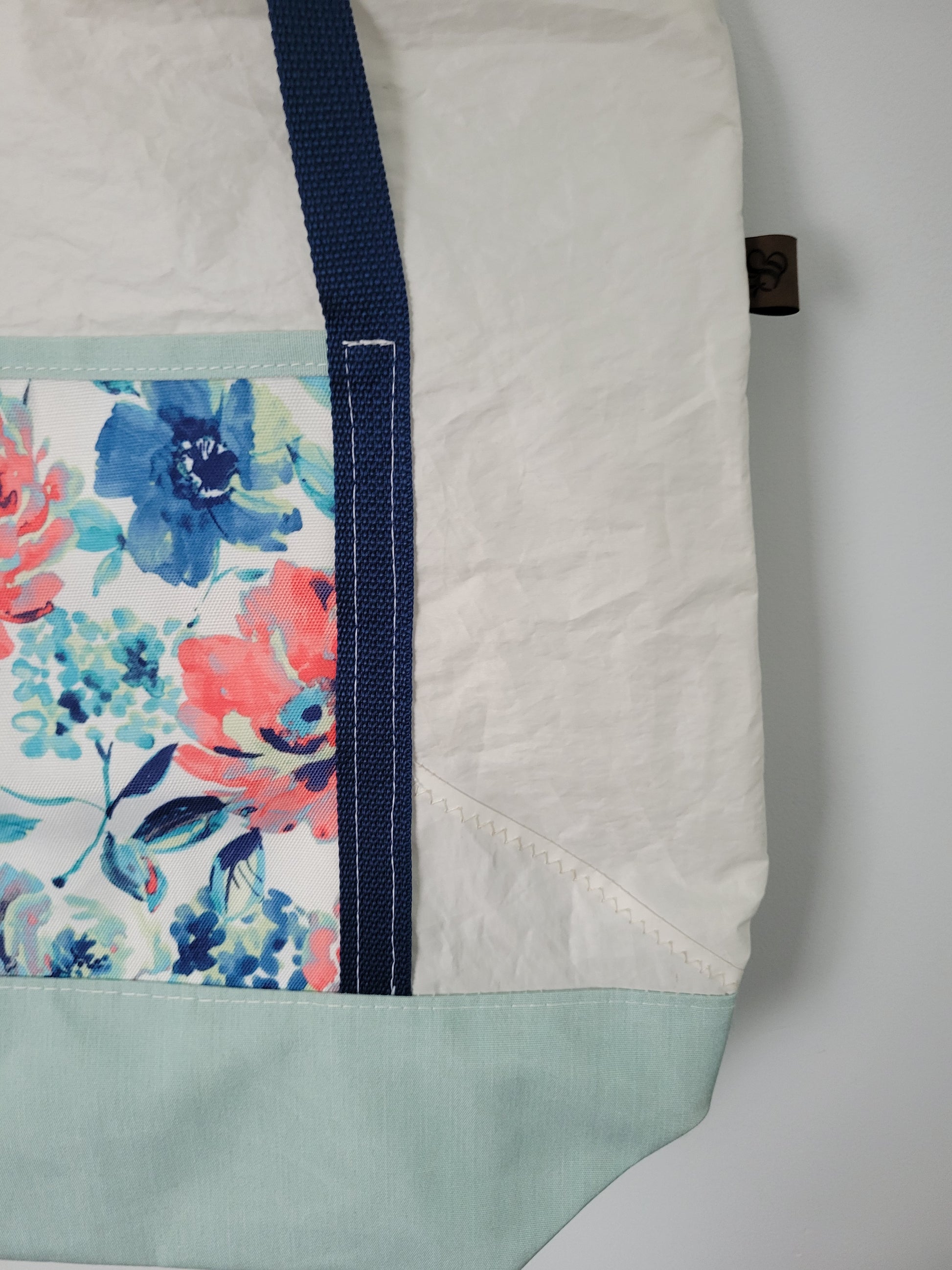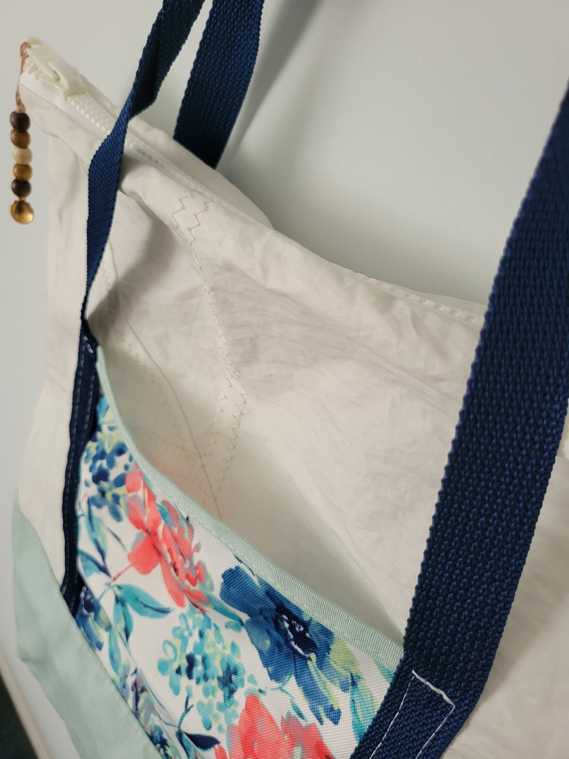 Handmade Canvas & Recycled Sail Tote Bag – Light Blue with Floral Pockets & Zipper Top