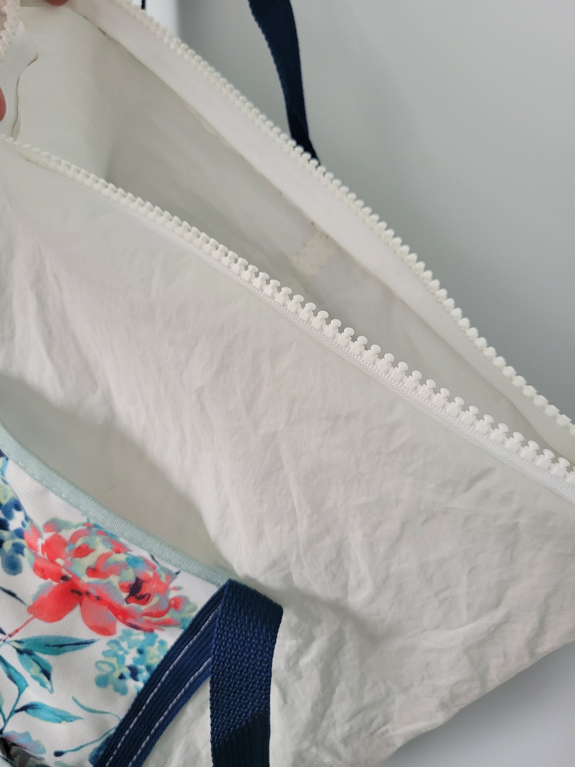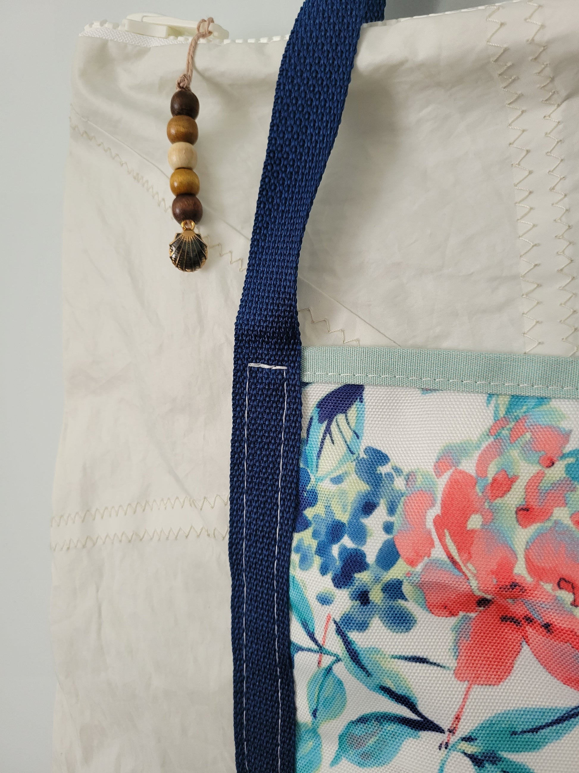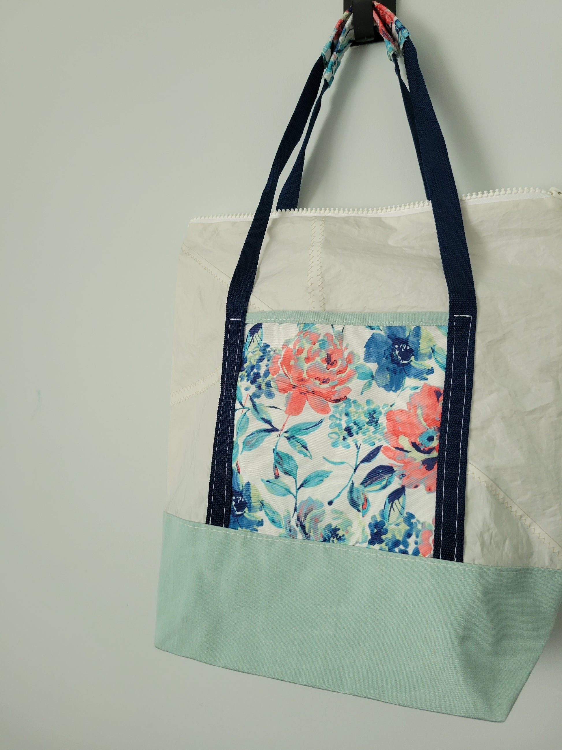 Handmade Canvas & Recycled Sail Tote Bag – Light Blue with Floral Pockets & Zipper Top