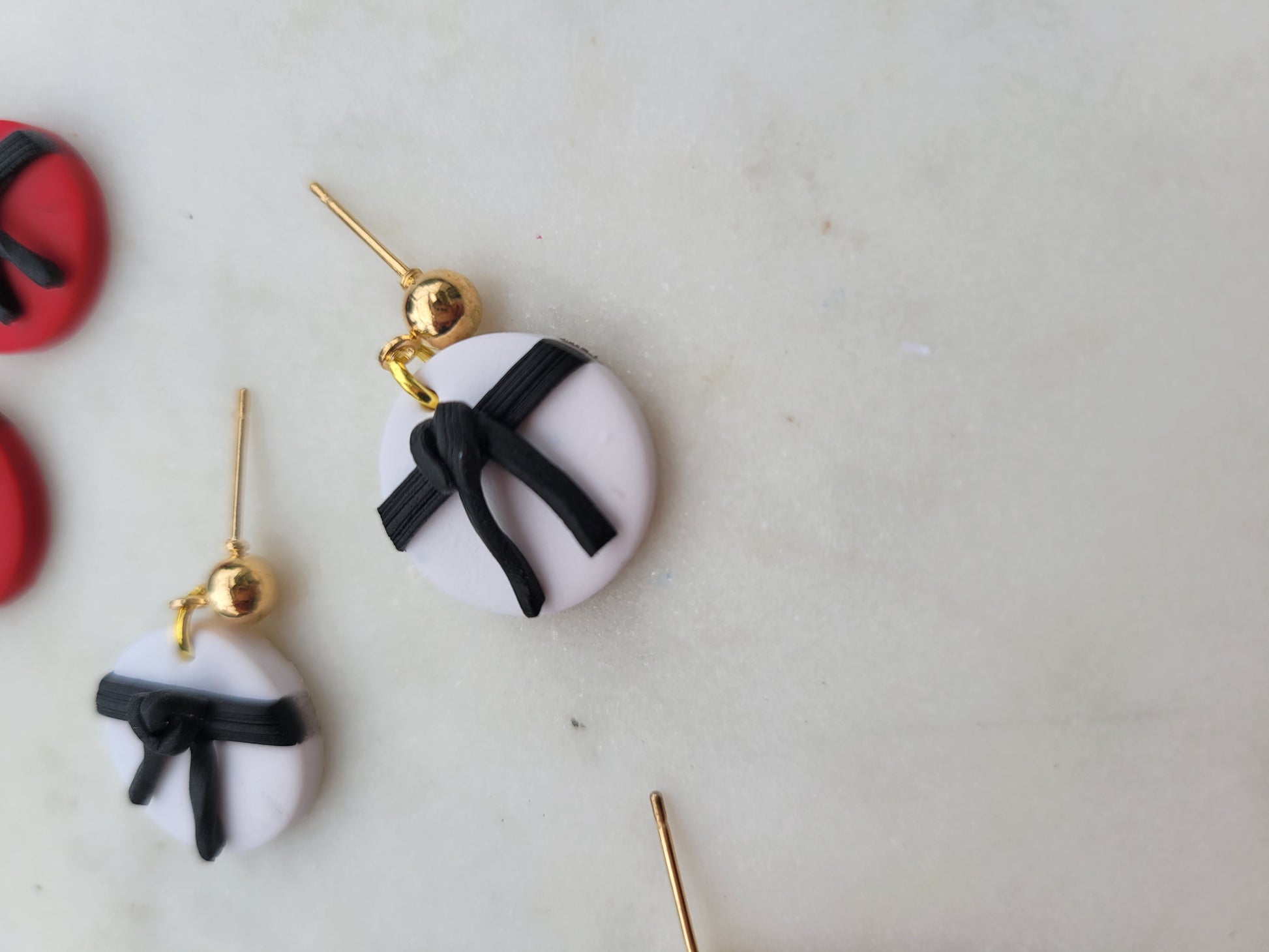 These small black belt dangles come in red or white. Custom belts can be made upon request!
